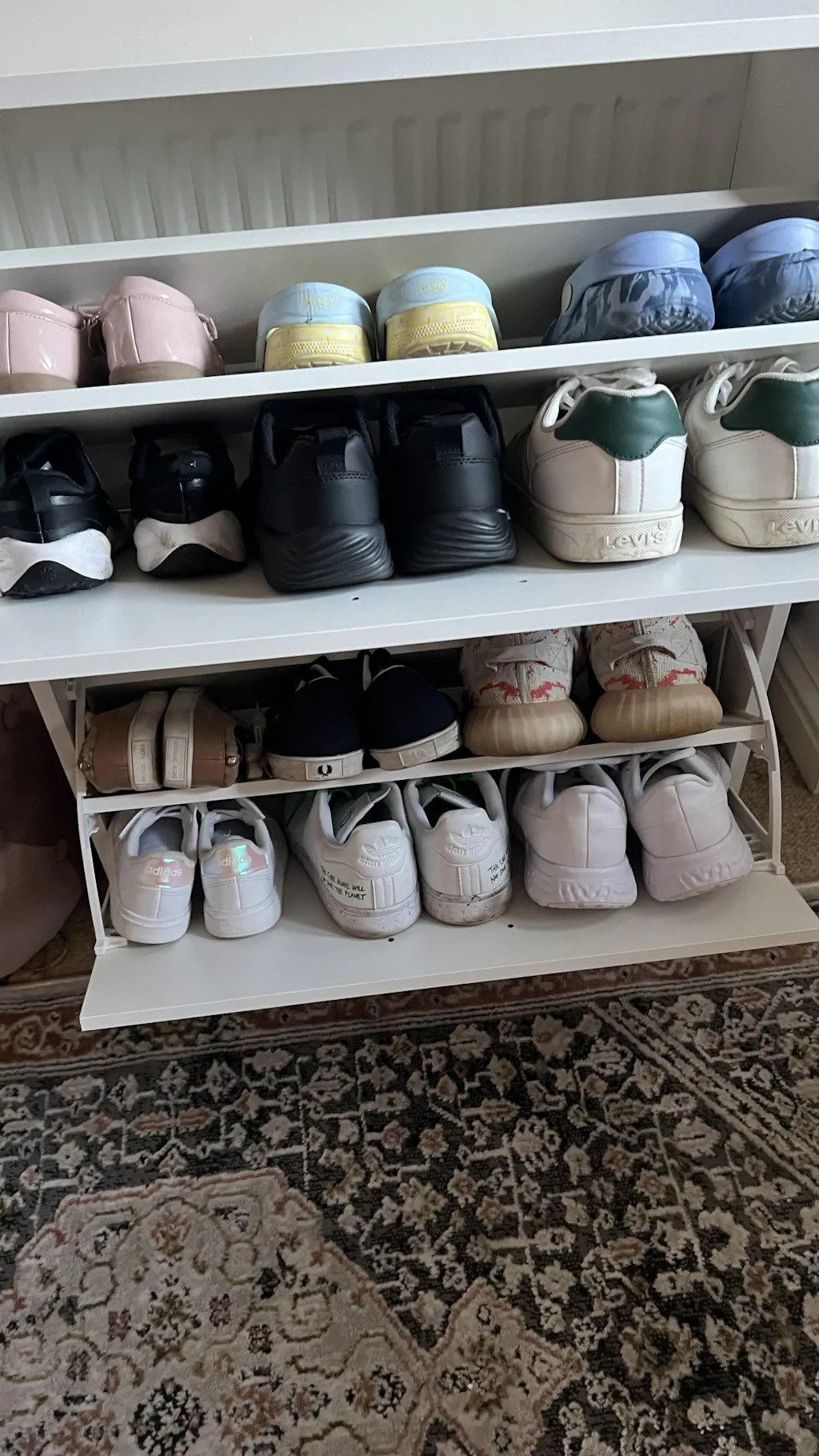 The ventilated design of the shoe storage unit promotes airflow, keeping footwear smell-free.