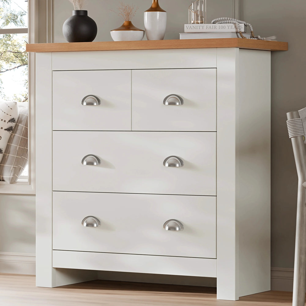 ![[White] 2 over 2 Chest of Drawers with white finish and oak top, featuring four drawers and chrome cup handles. Ideal for compact bedroom storage.](http://dreamhomestore.co.uk/cdn/shop/files/shaker-white-4-chest-of-drawers.webp?v=1771399400&width=1214)