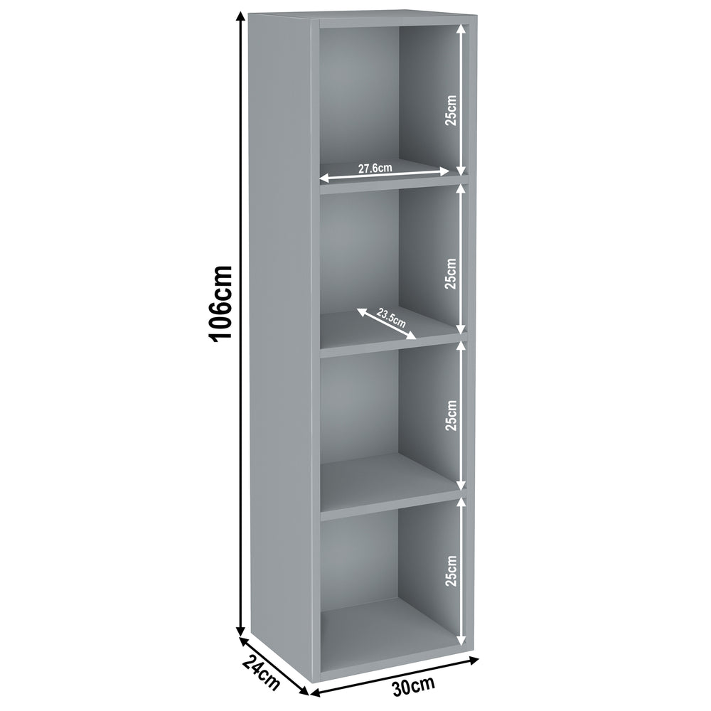 ![[4 Shelf | Grey] dimensions of 4 tier grey slimline bookcases, height 106cm and width 30cm. Shelf dimensions: height 25cm and depth 23.5cm](http://dreamhomestore.co.uk/cdn/shop/files/grey-4-tier-bookcase-cube-storage-unit-size.webp?v=1750685592&width=1214)