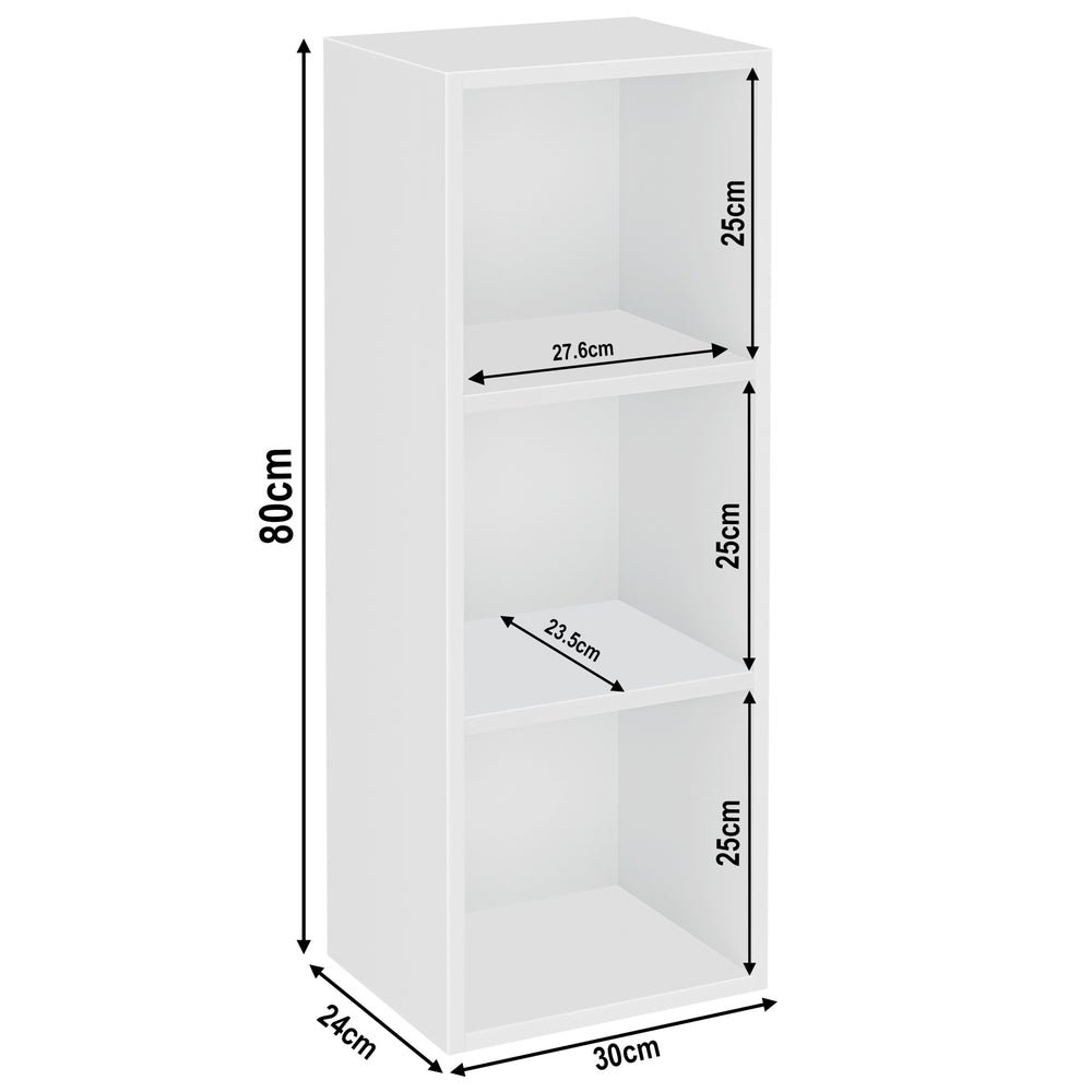 ![[3 Shelf | White] measurement details of 3 tier white slim bookcase, height 80cm and width 30cm. Shelf dimensions: height 25cm and depth 23.5cm](http://dreamhomestore.co.uk/cdn/shop/files/white-3-tier-bookcase-cube-storage-unit-size.webp?v=1750683966&width=1214)