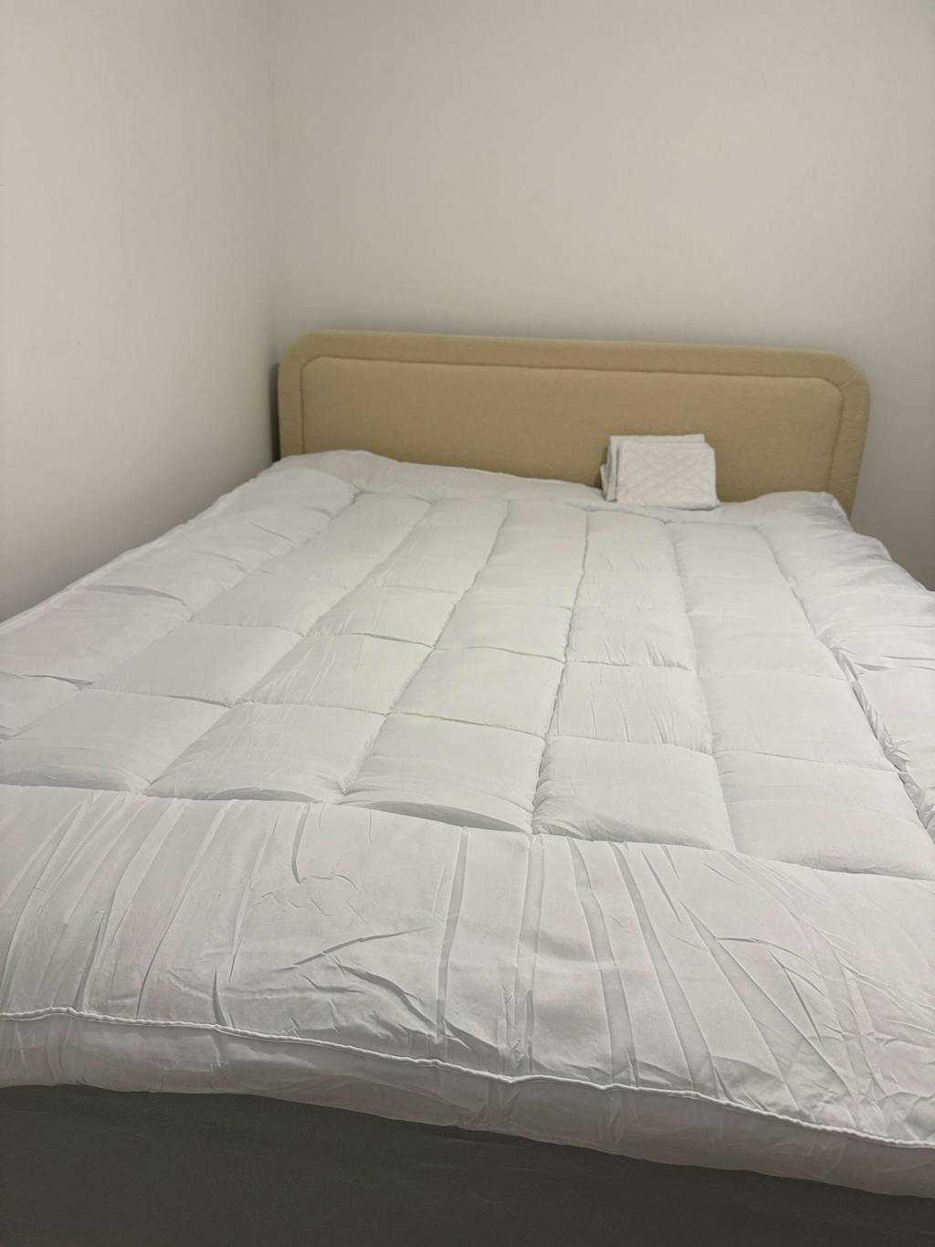 The bedroom features a double-panel headboard with a curved design that immediately catches your attention and provides comfortable support for leaning in while reading your favourite book.