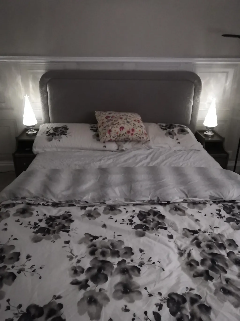The bedroom features a double-panel headboard with a curved design that immediately catches your attention and provides comfortable support for leaning in while reading your favourite book.