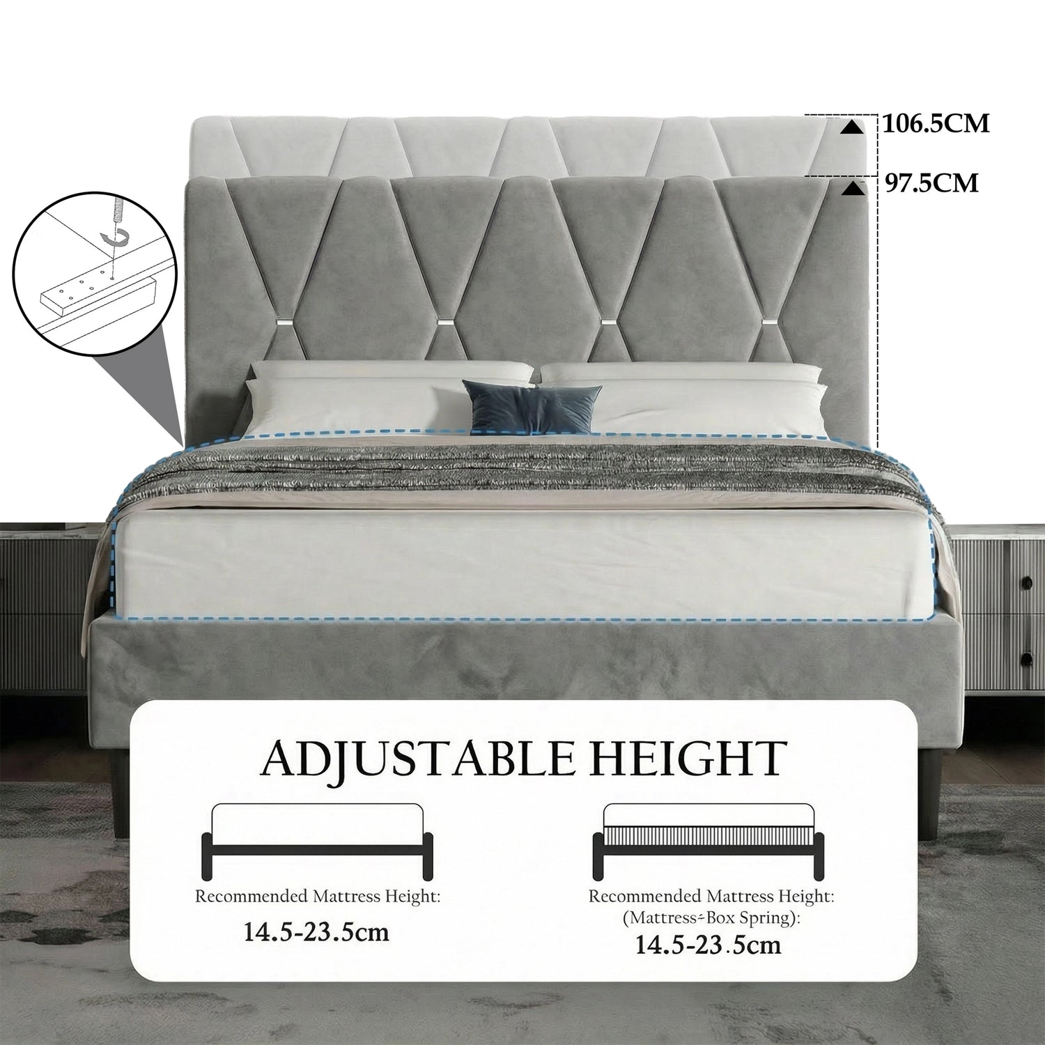 Flexible Mattress Fits: The adjustable headboard accommodates mattresses from 14.5 cm to 23.5 cm in thickness, offering you tailored comfort.