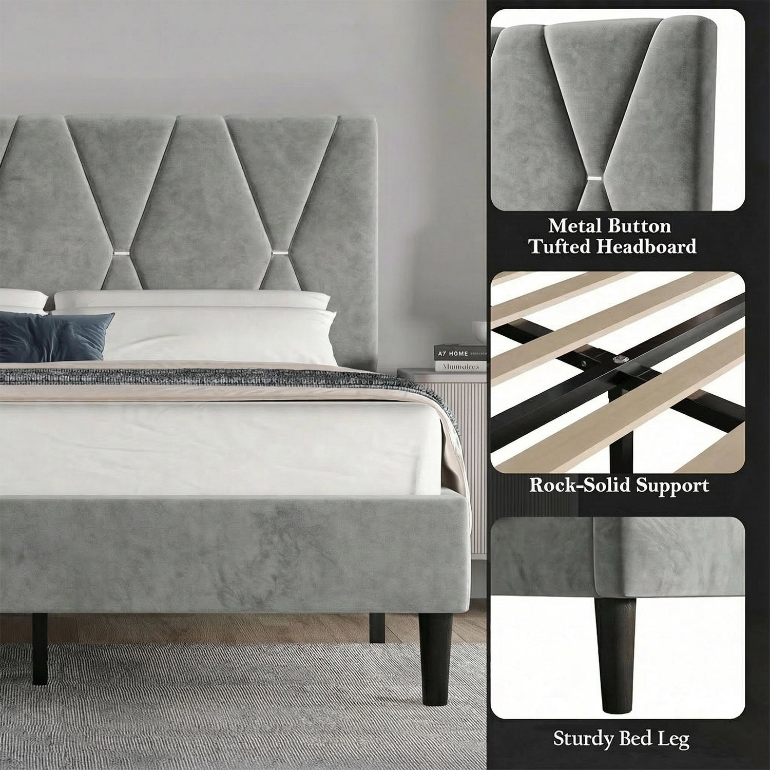 Built for Quiet Comfort: Made with engineered wood and a durable metal frame, wrapped in velvet to reduce noise and promote peaceful sleep.