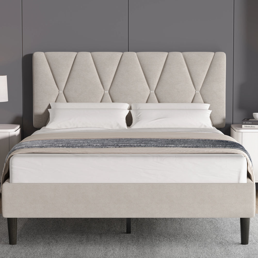Refined Modern Aesthetic: The upholstered bed frame features a minimalist, diamond design that fits seamlessly into various bedroom interiors.