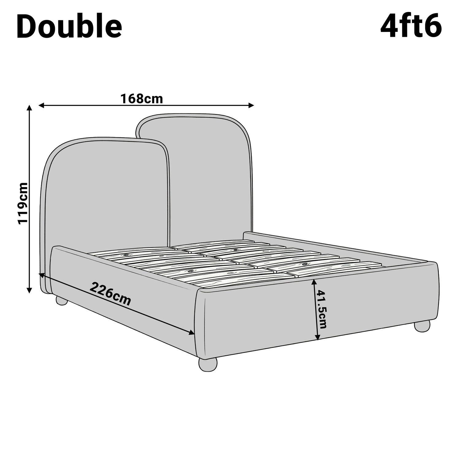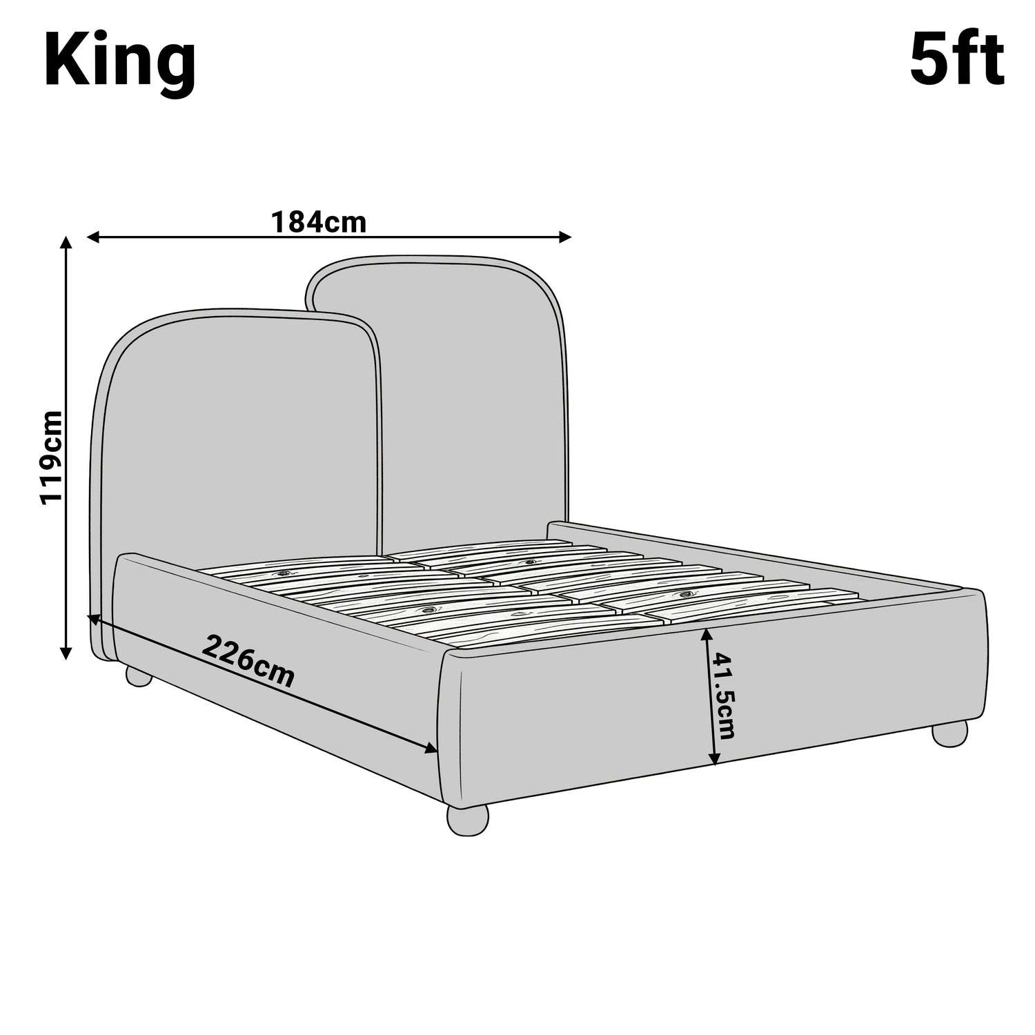 Size: Double (4ft6): (L): 226 cm, (W): 168 cm, (H): 119 cm, King (5ft): (L): 226 cm, (W): 184 cm, (H): 119 cm