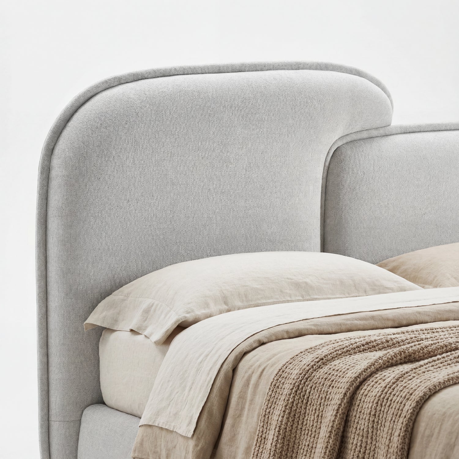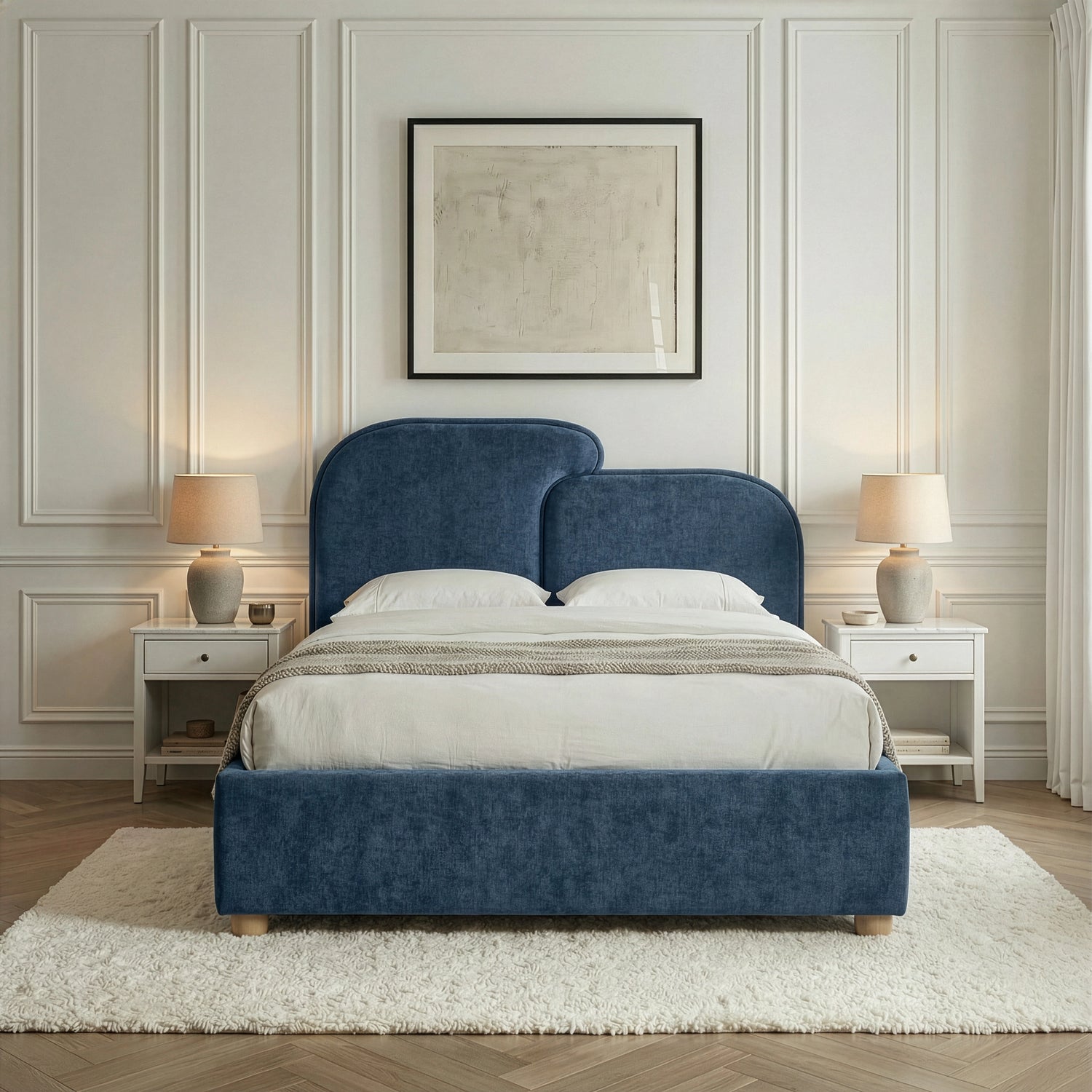 Rather than concentrating only on design, the Embrea bed frame is made with everyday comfort in mind. The split curved headboard and plush upholstered finish give it presence without overwhelming the room. Underneath, a metal frame with central support and extra legs provides even weight distribution across the mattress. The slatted base helps air circulate, and the low platform keeps the bed feeling grounded and comfortable. With larger-than-standard double and king sizes and three colour options, it fits comfortably into your bedroom.