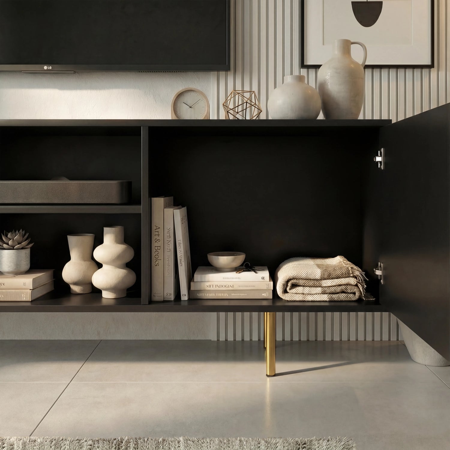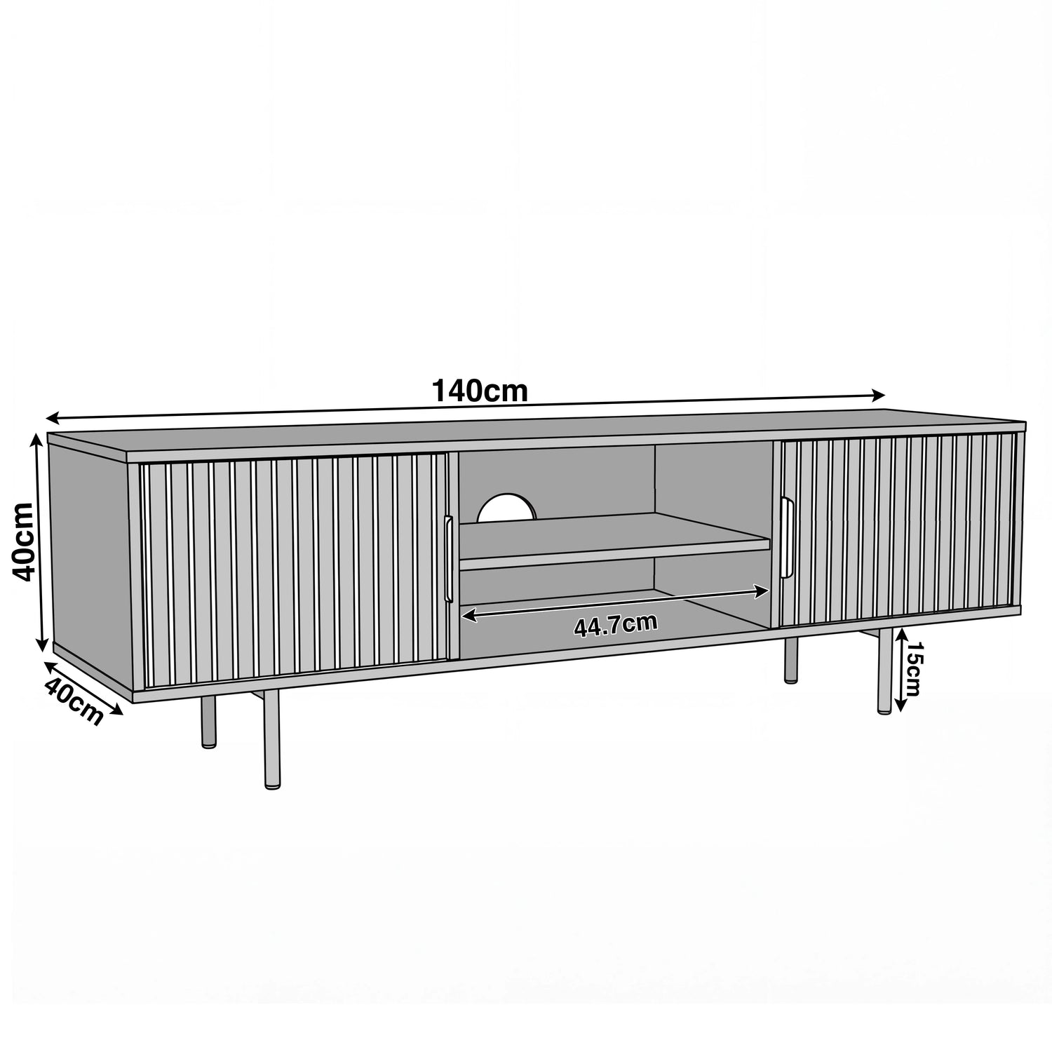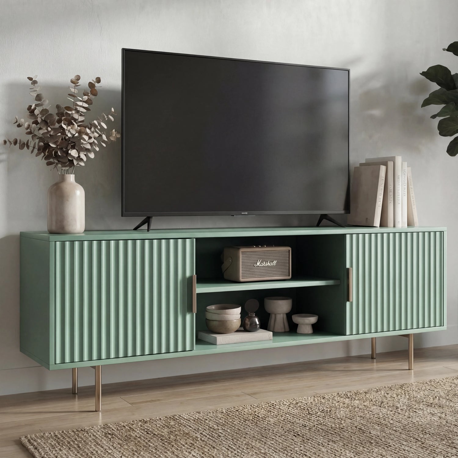 Perfect for contemporary homes, this TV stand with storage brings a modern edge to your living room with its fluted design. With a 140 cm width, it fits TVs from 43" to 55" with ease. Crafted from durable engineered wood with a stylish painted finish, this TV stand for a 55-inch TV is made for everyday use. It comes with two soft-close cabinets and an open shelf in the middle, giving you enough space to showcase or store your accessories. Available as a white, grey, sage green or black TV stand, you can easily match it to your interior.