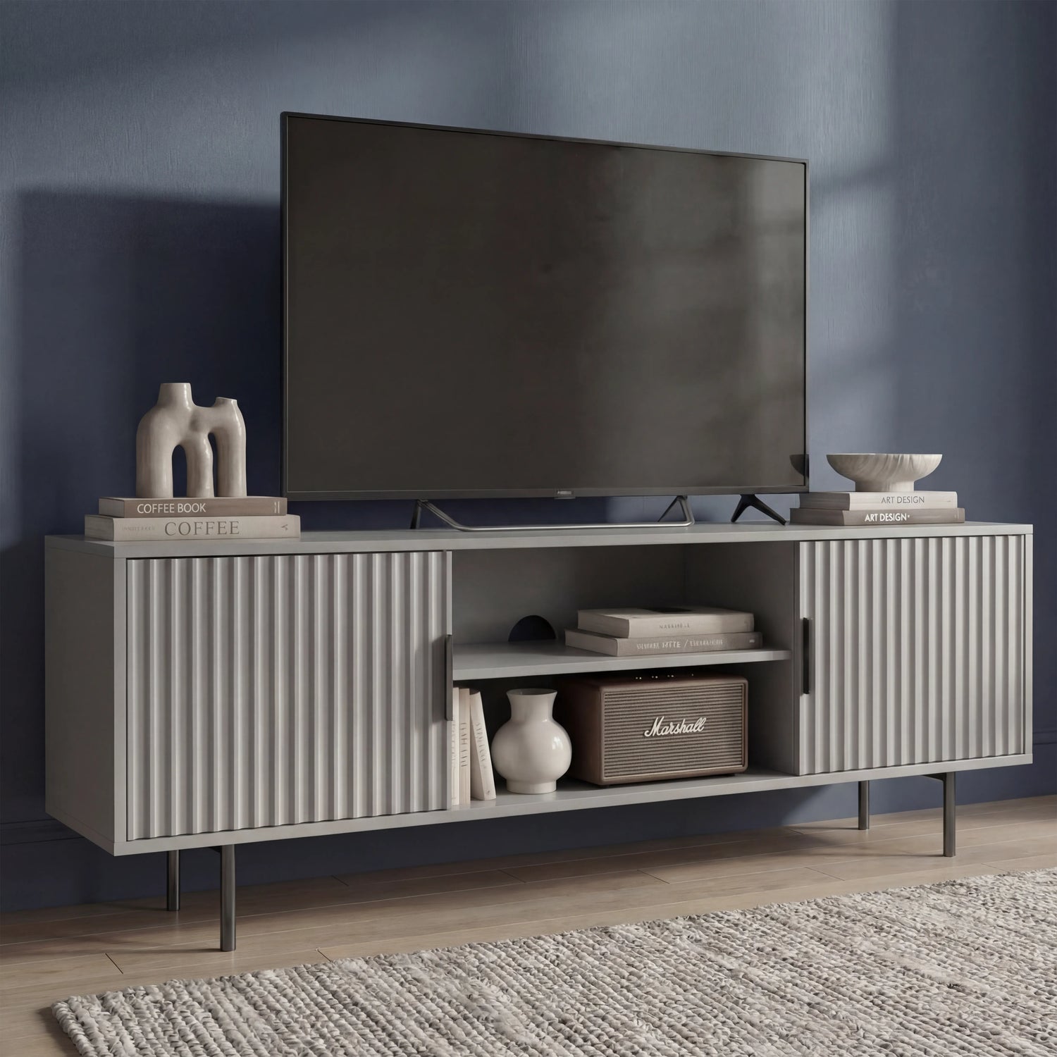 Modern Flute Design: This TV cabinet with storage comes with a ribbed texture on the front that makes a quiet statement in a modern living room space.