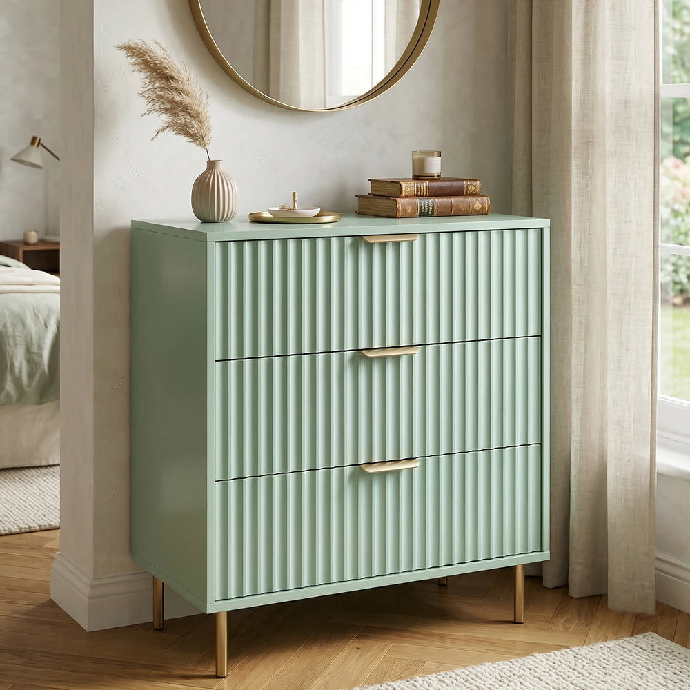 ![[Sage Green] Flutrina 3 drawer chest with vertical ribbed finish and golden metal support legs showing the sturdy base](http://dreamhomestore.co.uk/cdn/shop/files/flutrina-green-3-chest-drawer-front-view.webp?v=1775211354&width=1214)