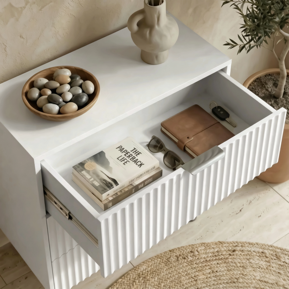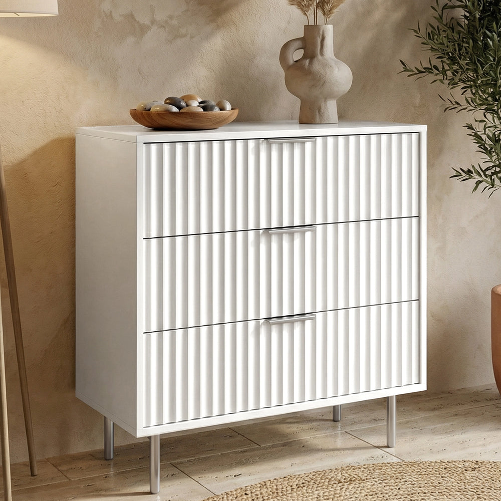 Turn any corner of your home into a modern storage heaven with this fluted 3 drawer chest of drawers. Smooth, silent drawers slide open easily, hiding away clothes, accessories, or knick-knacks in style. Crafted from quality materials with premium hardware and a painted finish, this low chest of drawers fits perfectly into bedrooms, hallways, or entryways. Available in black, white, grey and sage green finishes, pick one that suits your interior.