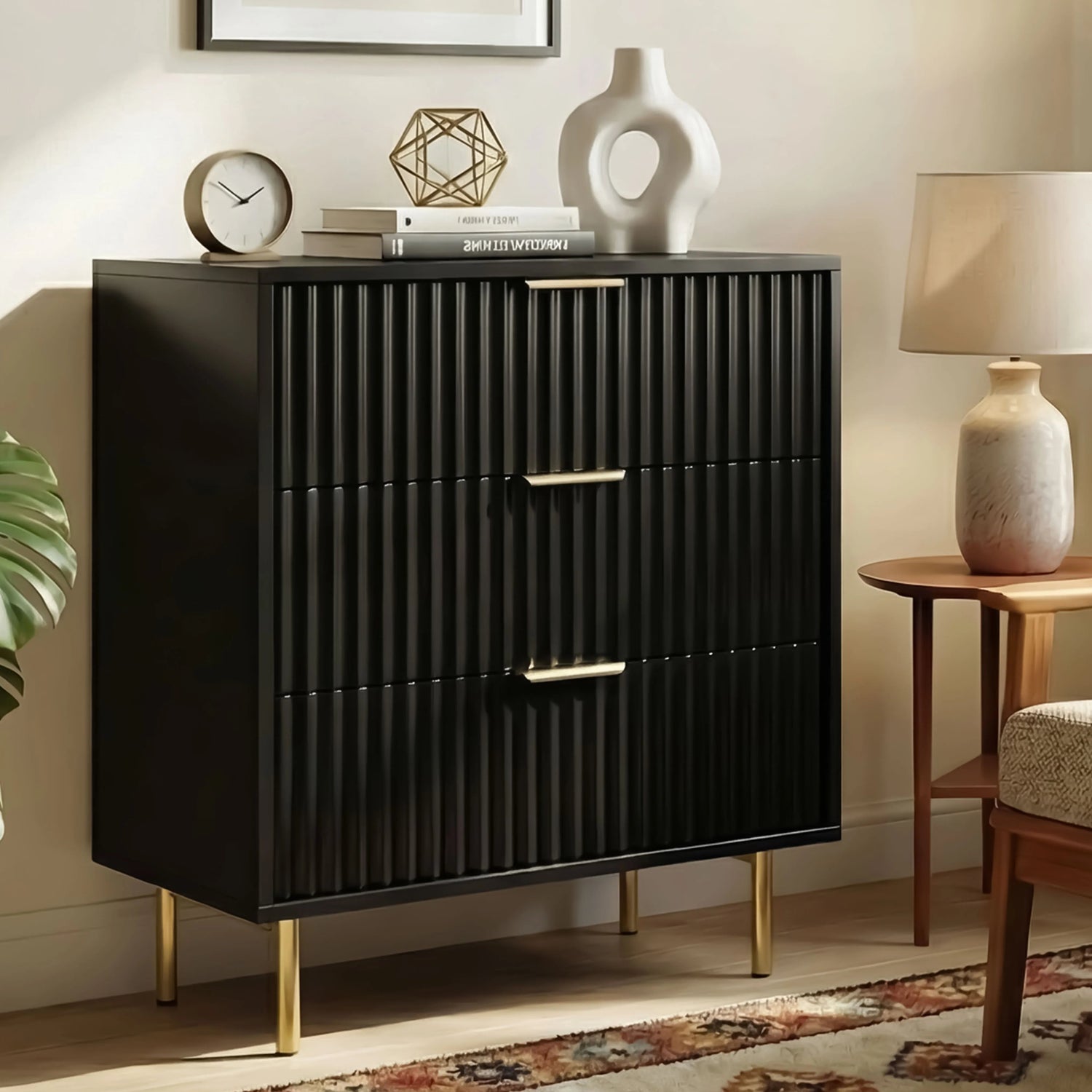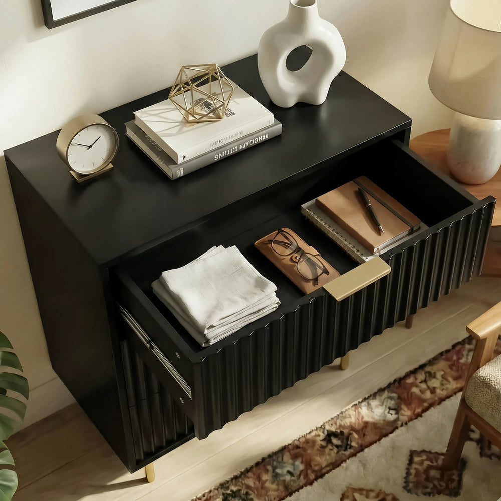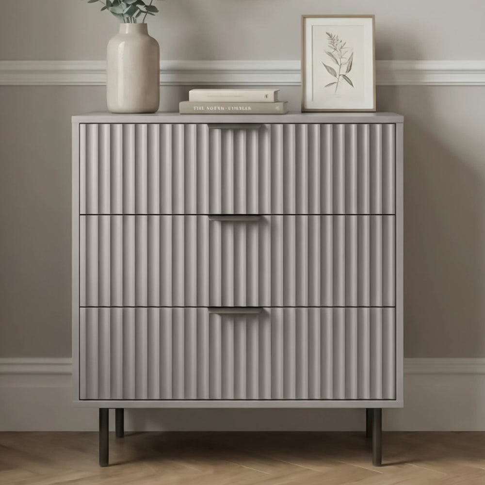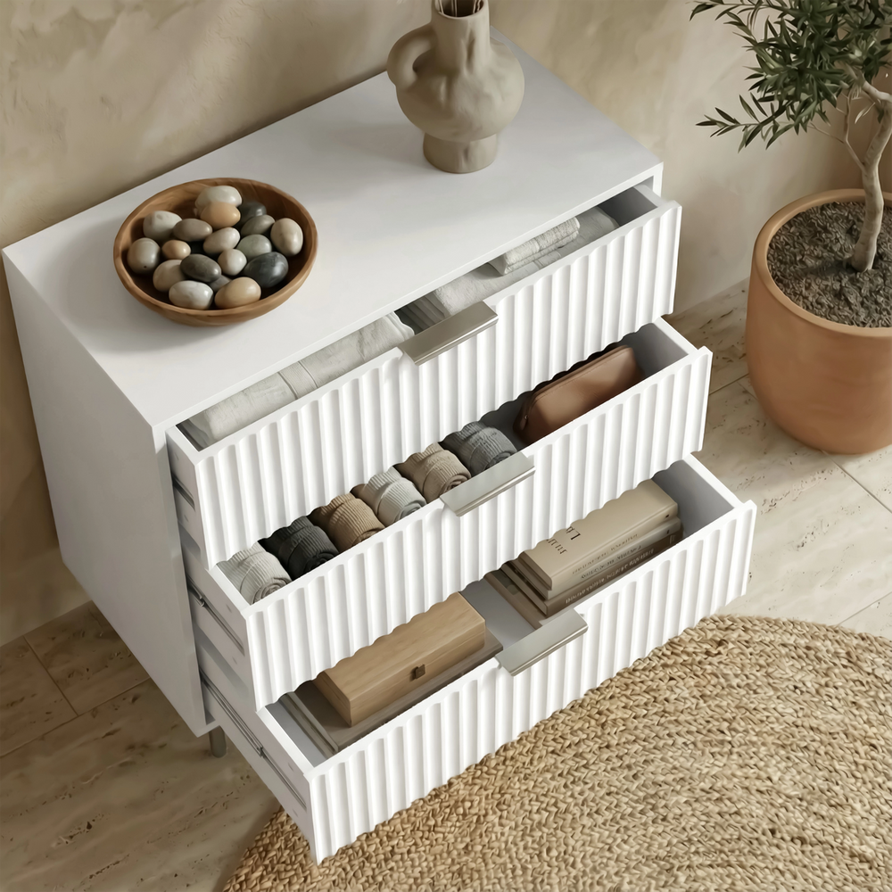 Modern Fluted Design: This 3 drawer chest of drawers features a unique fluted design that creates a visual flow and goes well with most interiors.
