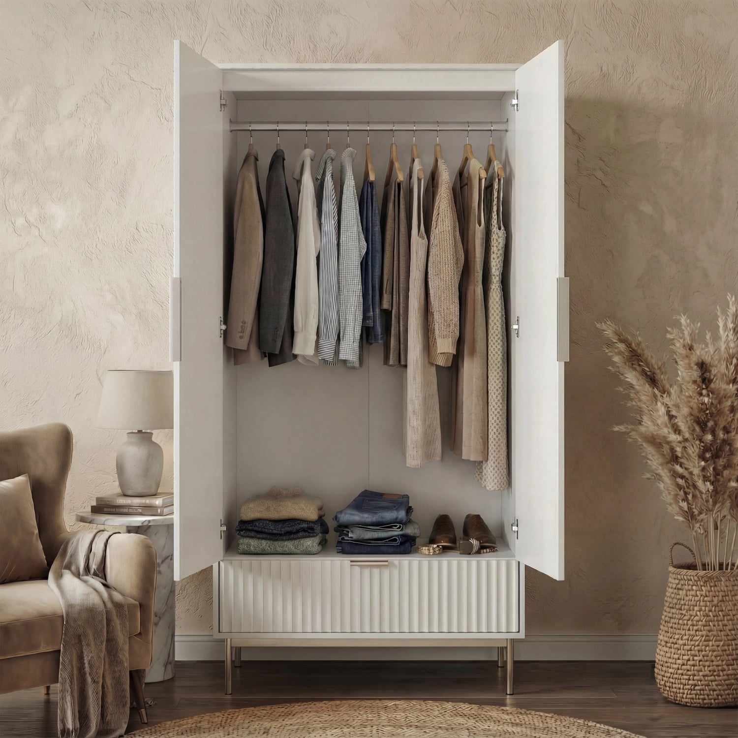 All-in-One Bedroom Storage: The wardrobe set has a 2-door wardrobe, a 3-drawer chest, and a 2 drawer bedside table to handle all storage needs.