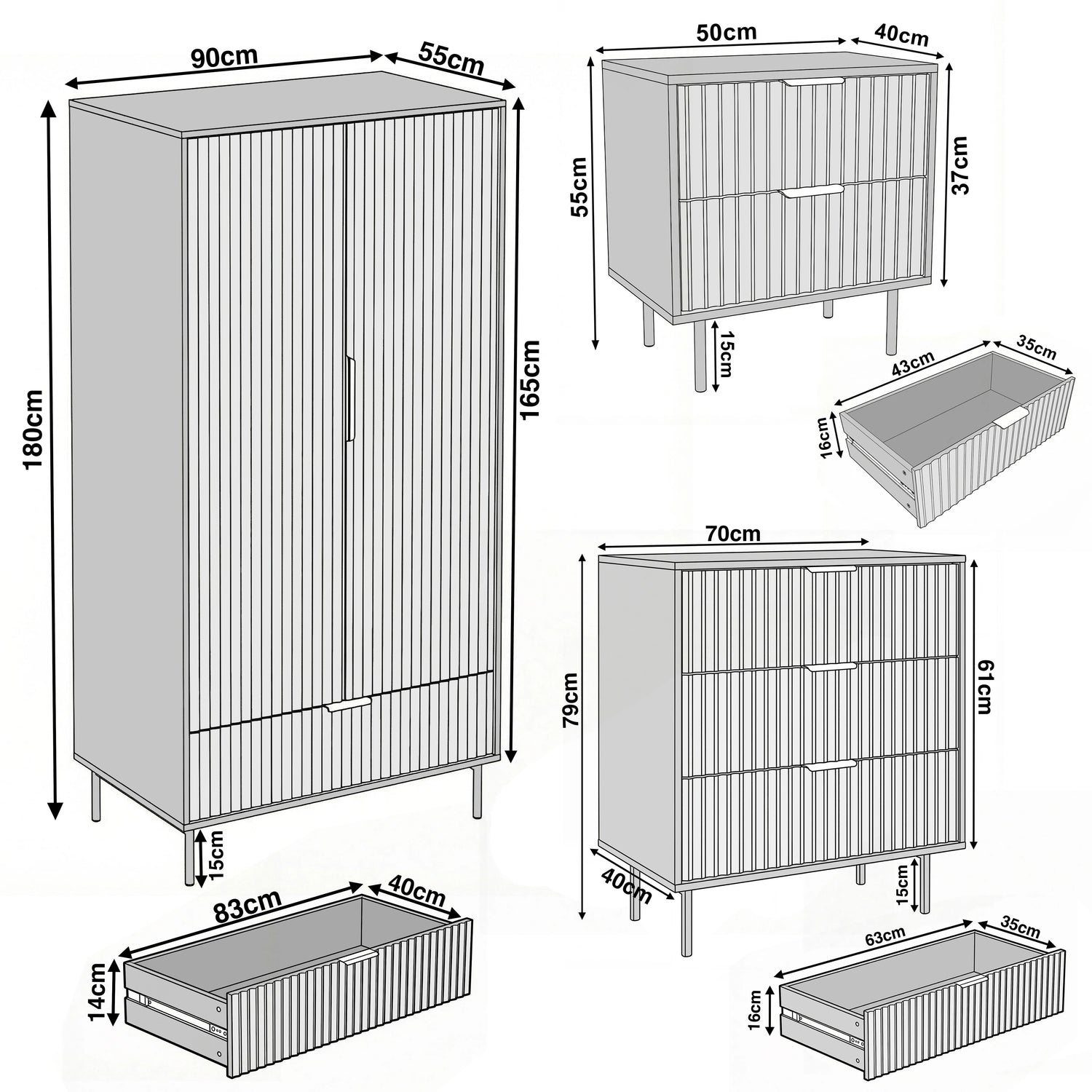 Size: Wardrobe :- (W) 90cm x (D) 55cm x (H) 180cm, 3 Chest :- (W) 70cm x (D) 40cm x (H) 79cm, Bedside Table :- (W) 50cm x (D) 40cm x (H) 55cm