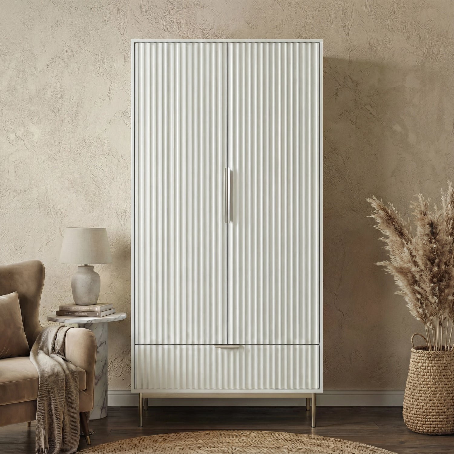 Material: 18mm MDF Fluted Board, Painted Finish, Metallic Handles