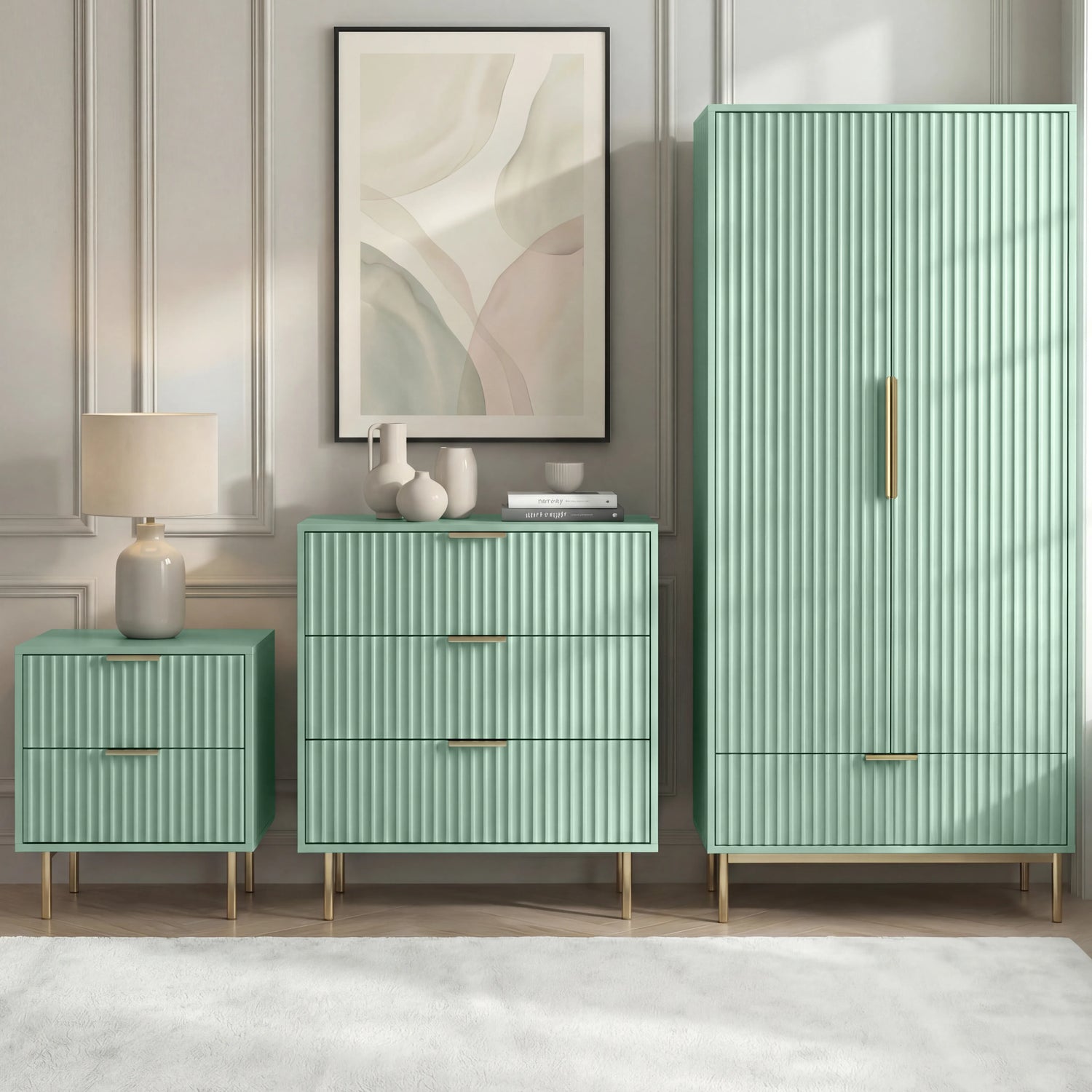 Designed to add depth to everyday living, this Flutrina 3 piece bedroom furniture set offers practical storage with a softer look. Featuring a 2 door wardrobe, 3 drawer chest of drawers, and a 2 drawer bedside table, this set comes with enough space to keep everything organised and within easy reach. Crafted from durable engineered wood with metal accents and a scratch-resistant painted finish, it's perfect for everyday use. Available as black, grey, sage green, or white bedroom furniture set, you can seamlessly blend it with your existing interior.