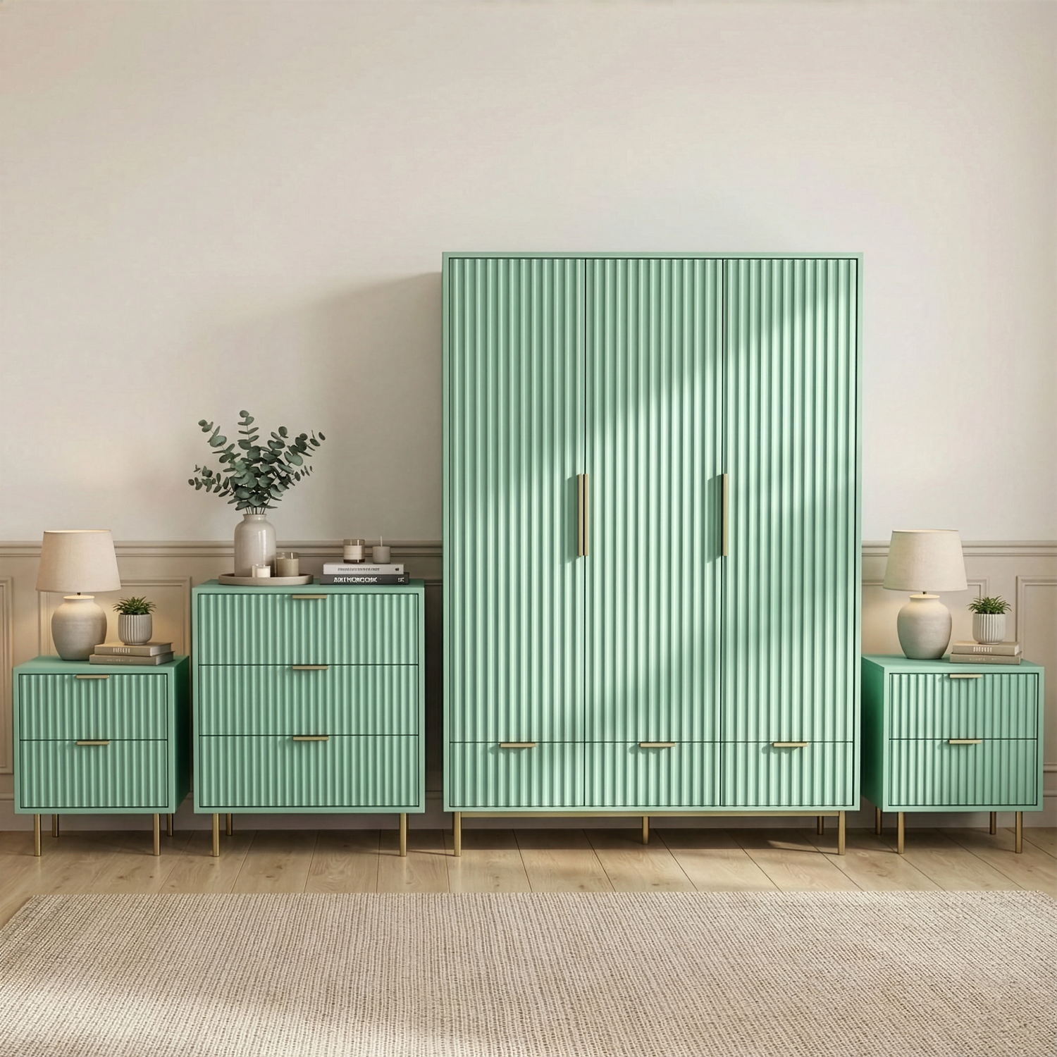 Designed with everyday comfort in mind, this flutrina 4 piece bedroom furniture set offers generous storage with a calming, modern look. It comes with a 3 door wardrobe to keep outfits wrinkle-free, a 3 drawer chest of drawers for folded clothes and a pair of bedside table for your night-time essentials. Crafted from quality engineered wood with durable, scratch resistant painted finish, it takes care of your storage needs for a long time. Available as a grey, black, sage green and white bedroom furniture set, you can pick one that suits your space.