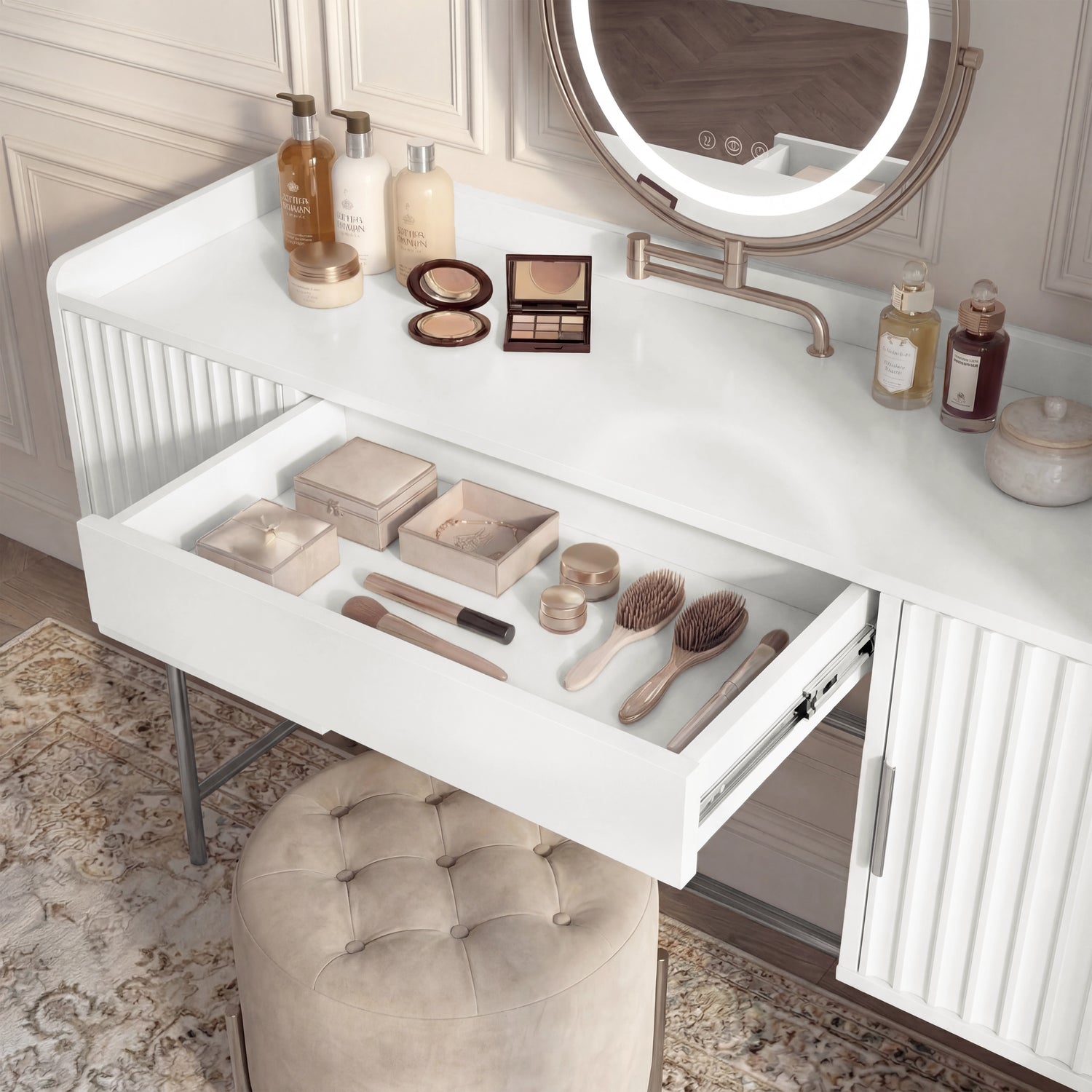 Roomy Middle Drawer: This makeup table features a handle-less middle drawer with ample space to store essentials like brushes or accessories.