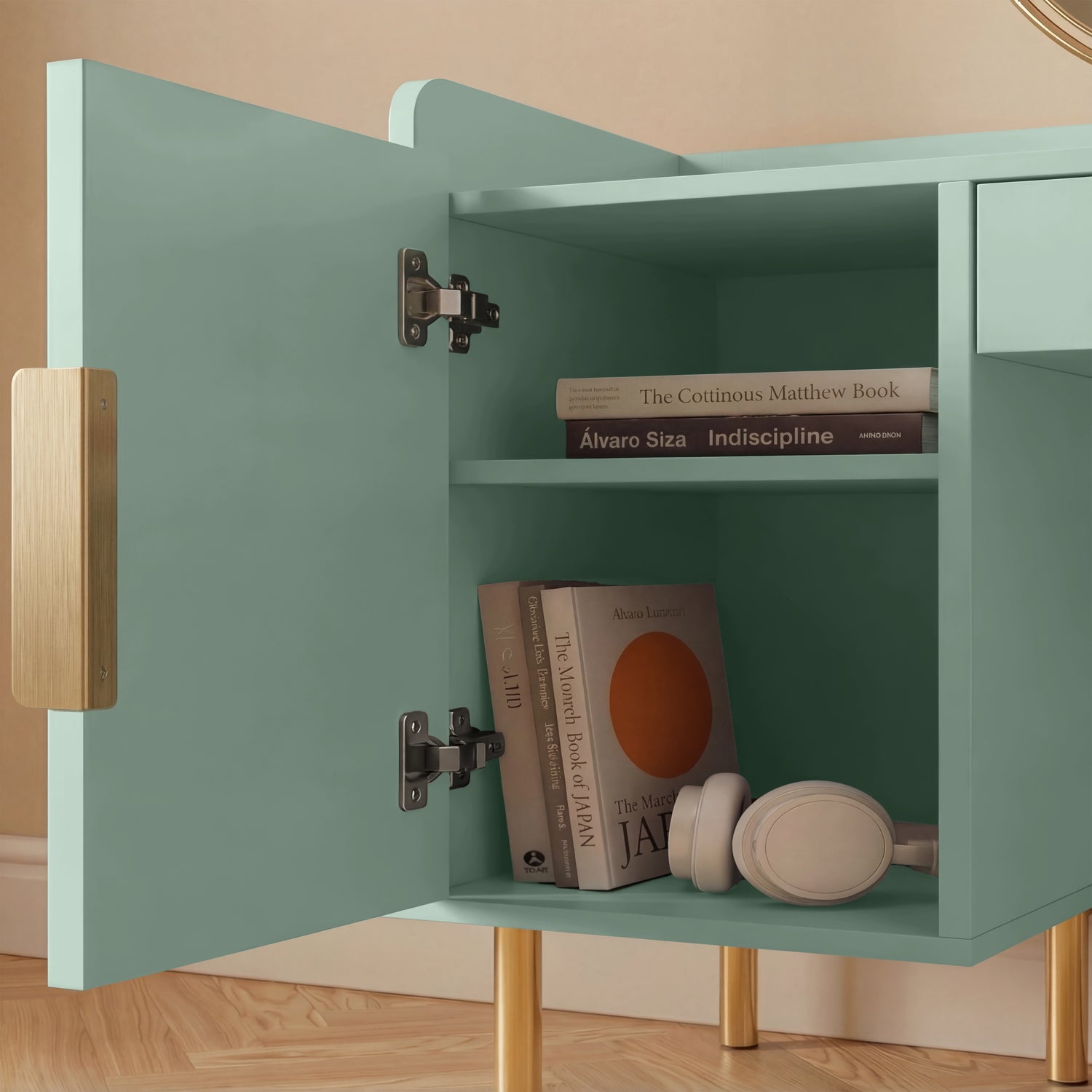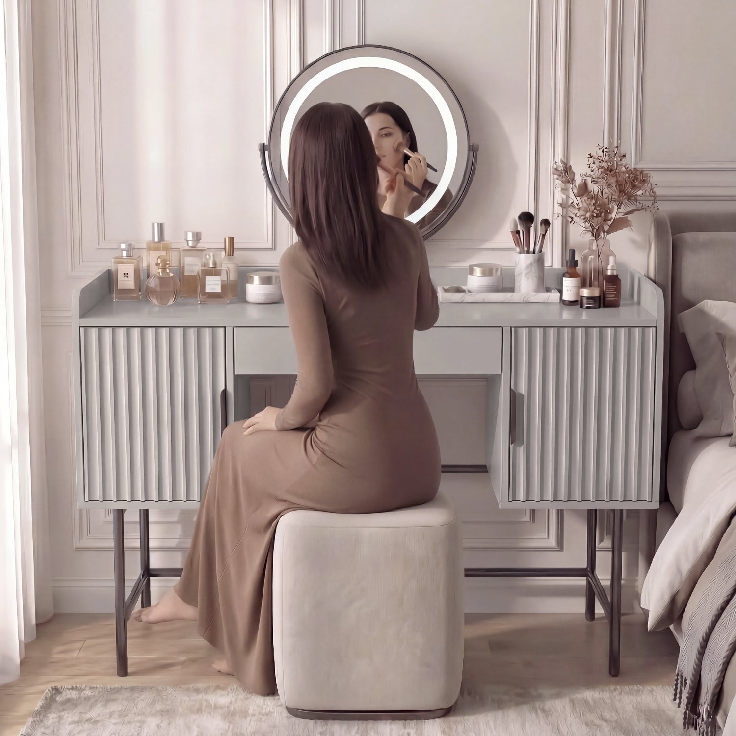 Two Spacious Cabinets: Offering ample storage for larger items, fragrances, and personal belongings, this makeup desk comes with two side cabinets.