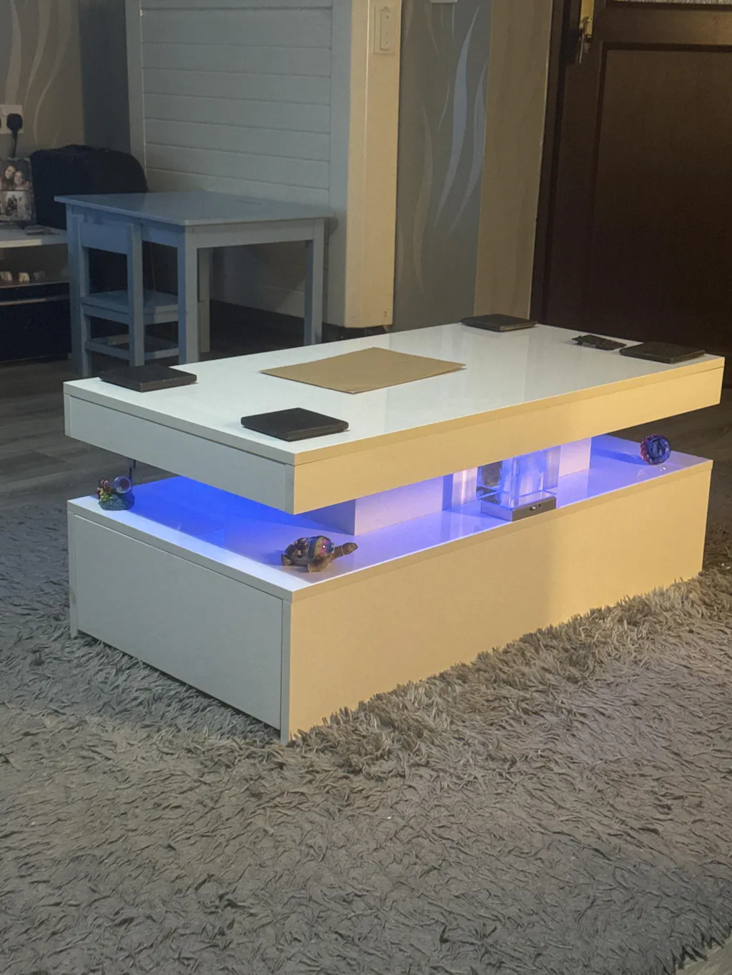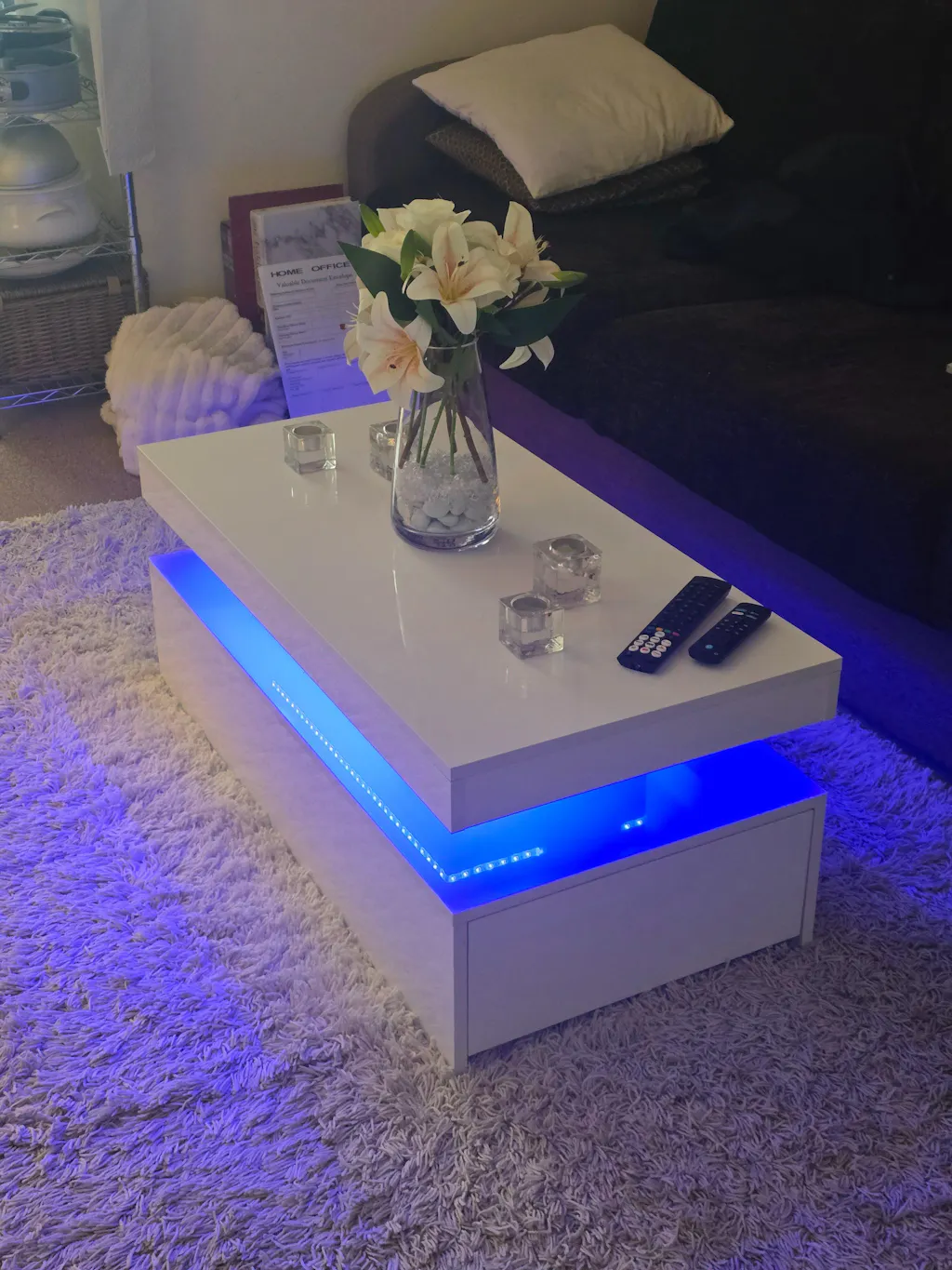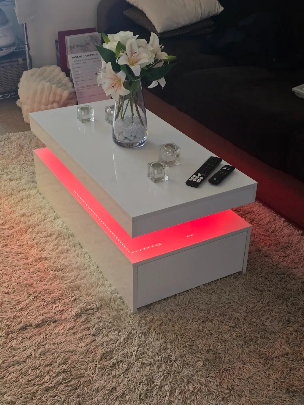 Why you’ll love our high-gloss coffee table with storage and LED lights.