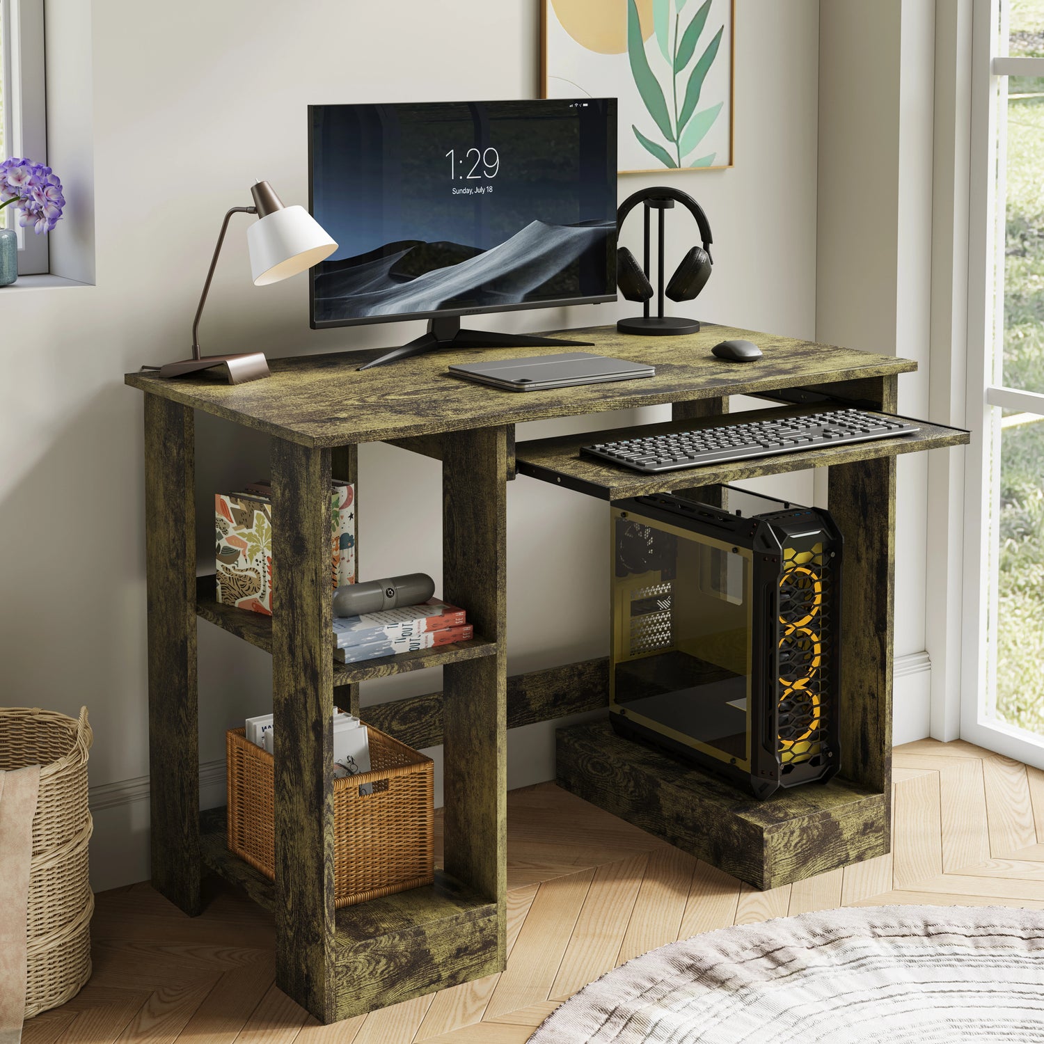 This is the small computer desk that makes getting some work done a little easier. With its simple design and clever storage space, this home office desk with storage and shelves fits right in anywhere. Its sliding tray hides your keyboard and mouse when you’re done, giving you room to work without drowning in clutter. Built from sturdy engineered wood, this office desk with shelves is tough enough for everyday life and slim enough for compact spaces. Available in white, rustic oak, or black, this home office study desk is quick to build and makes your everyday work much easier once assembled.