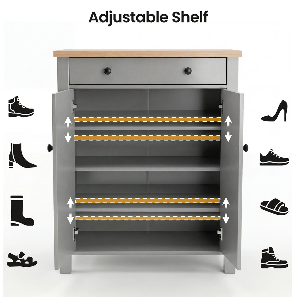 Linra Grey 4 Tier Shoe Storage Cabinet With Drawer Oak Top - Shoe Storage / Grey is backordered and will ship as soon as it is back in stock.