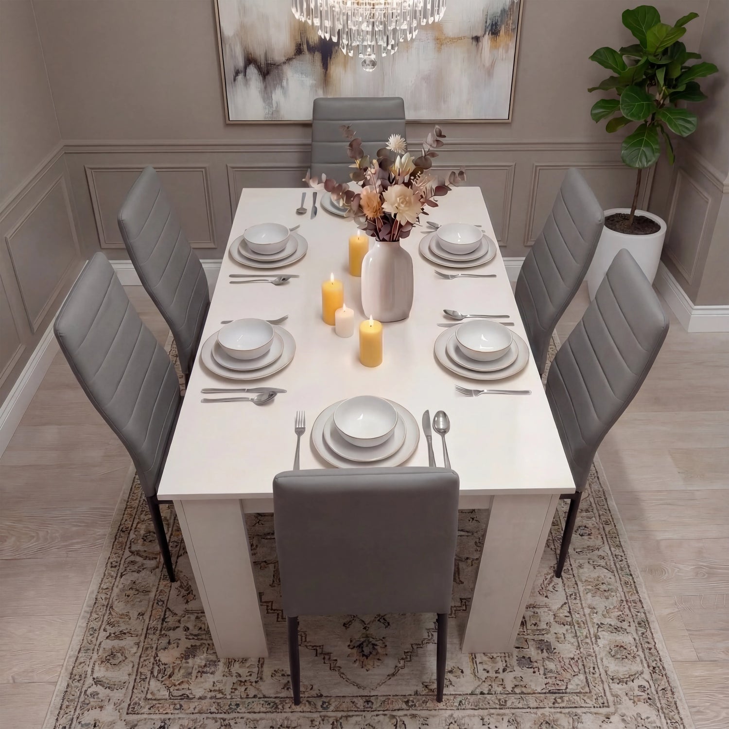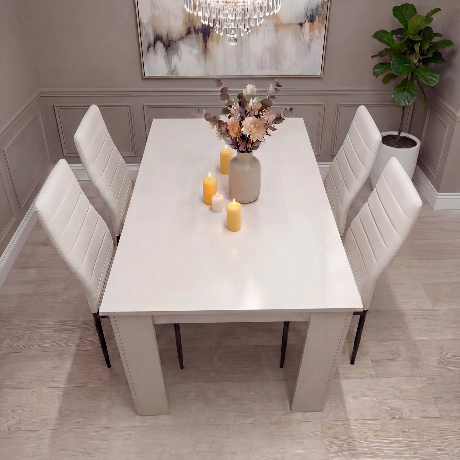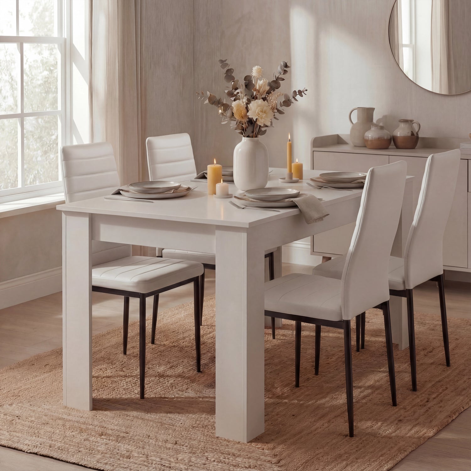 Timeless Modern Look: This dining table and chair set features a bright white-finished table that brightens the room and complements most interiors.