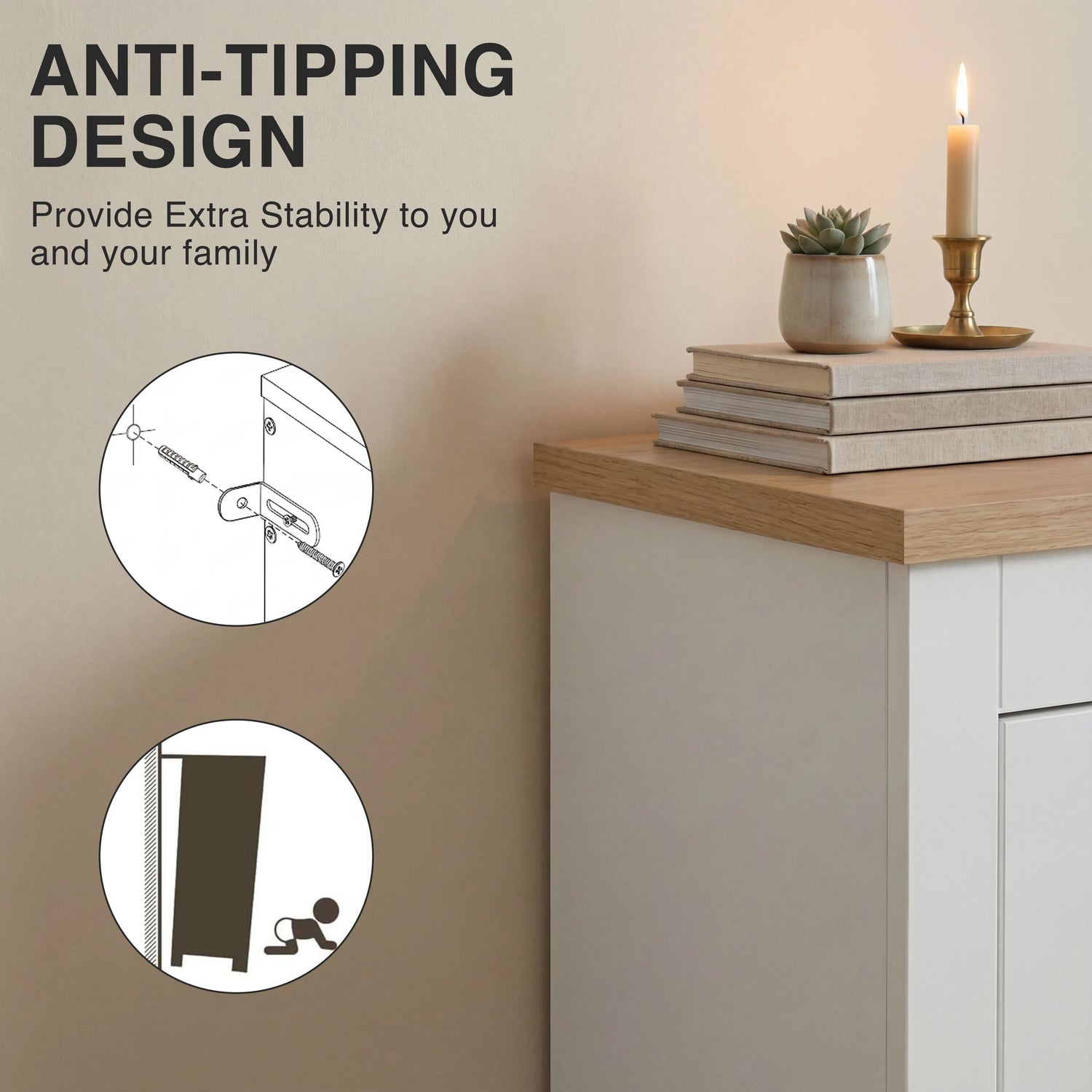 Anti-tip brackets prevent the narrow shoe cabinet from tipping, making it stable.