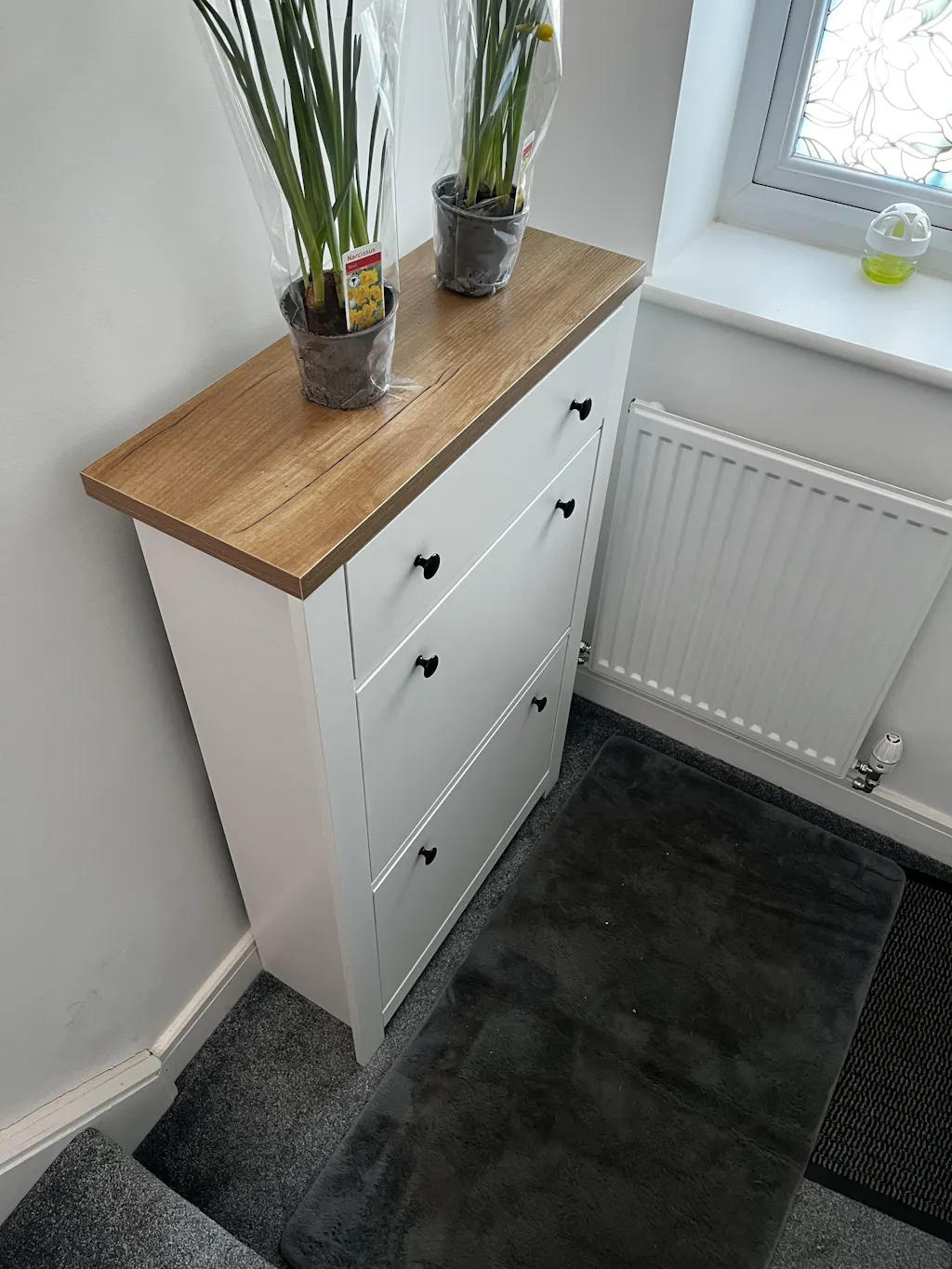 ![[White] Oak-effect top surface styled with potted fern books and photo frame for hallway display](http://dreamhomestore.co.uk/cdn/shop/files/2-door-shoe-cabinet-white-oak-top-surface-detail.webp?v=1774615644&width=1214)