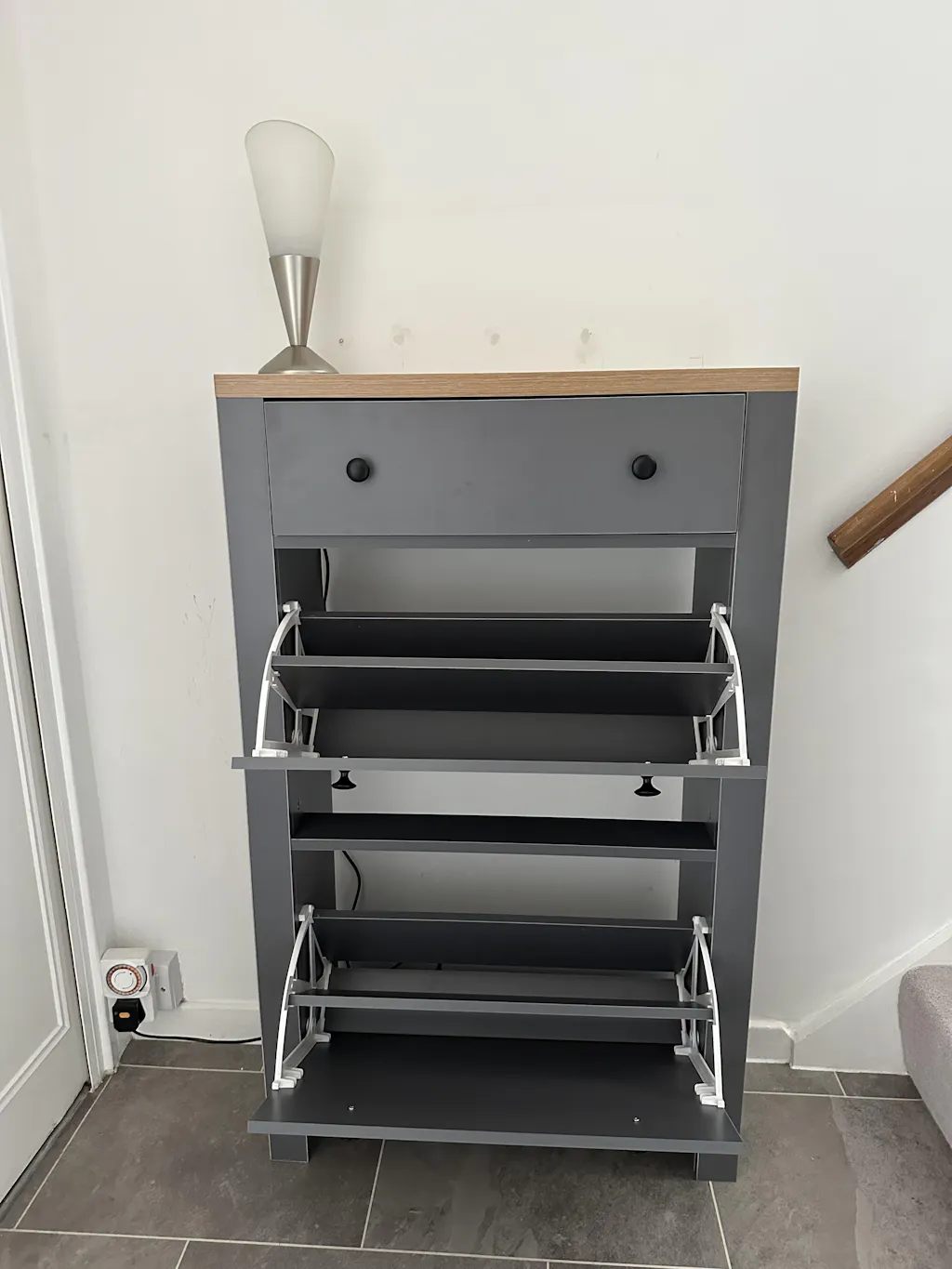 ![[Grey] Slim hallway shoe cabinet with bottom flip-down door open showing shoes organised on angled racks](http://dreamhomestore.co.uk/cdn/shop/files/2-door-shoe-cabinet-grey-hallway-bottom-door-open.webp?v=1774616848&width=1214)
