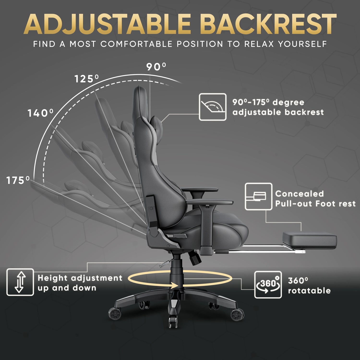 Soft Leather-Like Finish: The computer gaming chair with footrest is wrapped in soft PU + PVC leather that feels smooth, giving comfort through long sessions.
