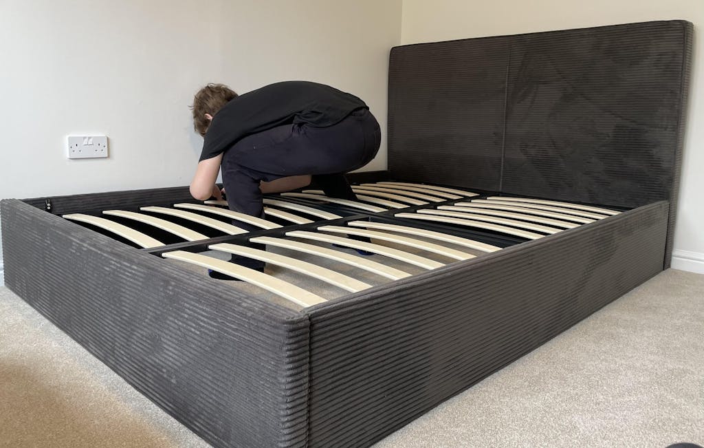 Slatted Base: This double ottoman bed has a slatted base with a metal frame to support the mattress and improve airflow.