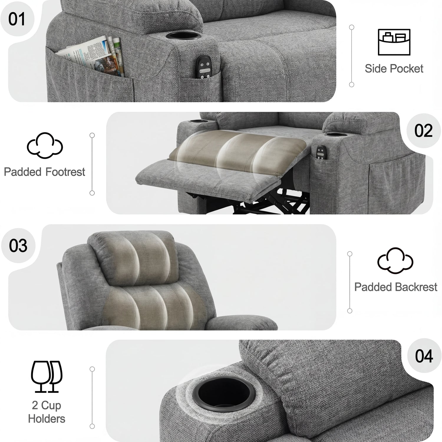 - Practical Touches: Side pockets for remotes and books, plus a handy cup holder, keep your essentials within simple reach.