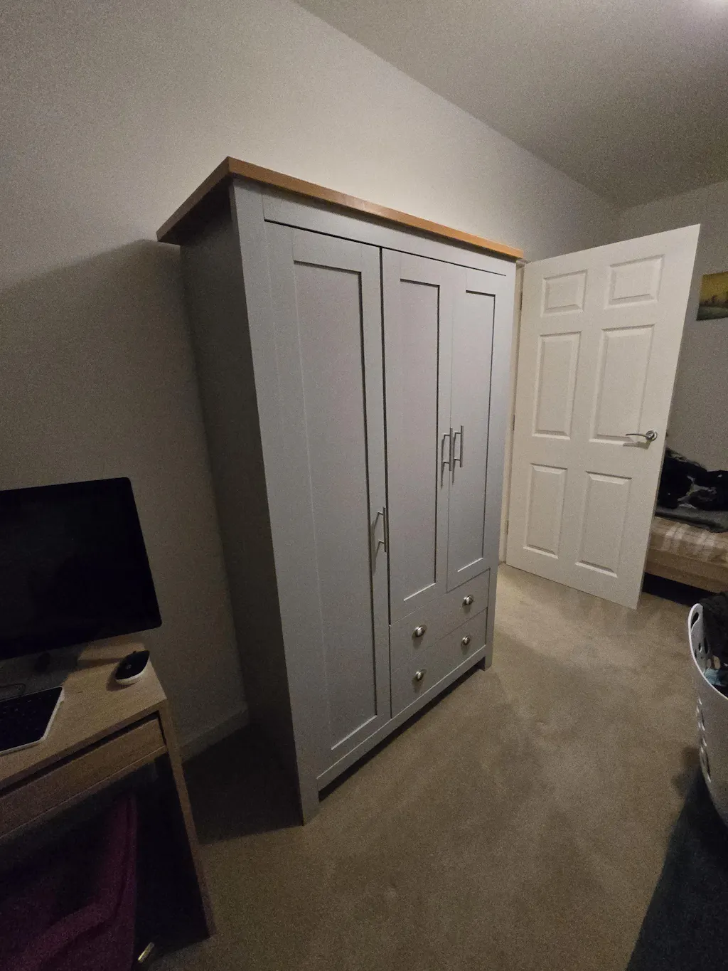 ![[White] shaker 3 door wardrobe with oak top panel doors t-bar handles and 2 cup drawers](http://dreamhomestore.co.uk/cdn/shop/files/white-shaker-3-door-wardrobe-front-view.webp?v=1774357799&width=1214)