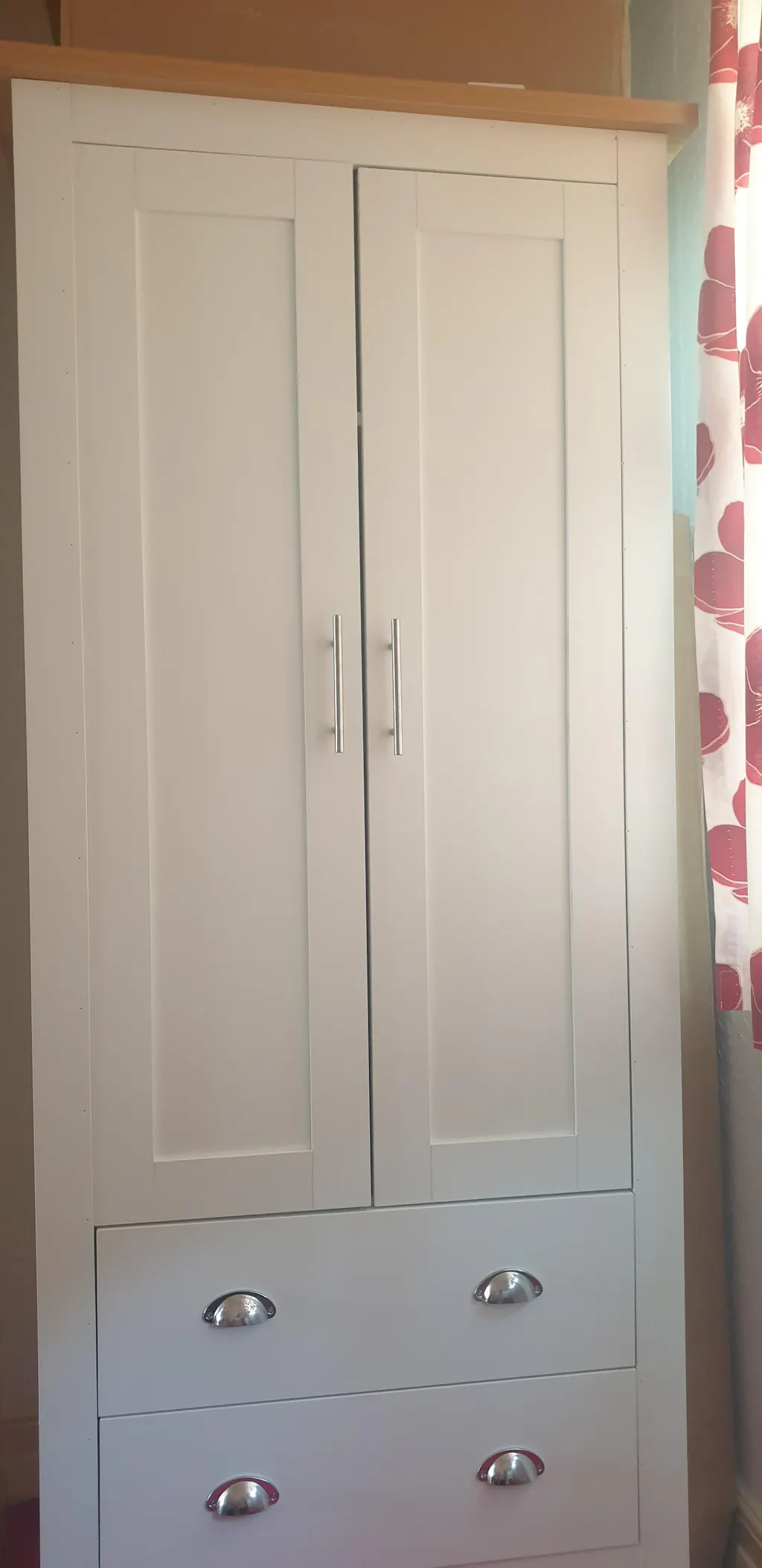 This two-door shaker wardrobe with drawers comes with a shaker style and an oak-effect top, making it ideal for people who like simple, minimalist designs.