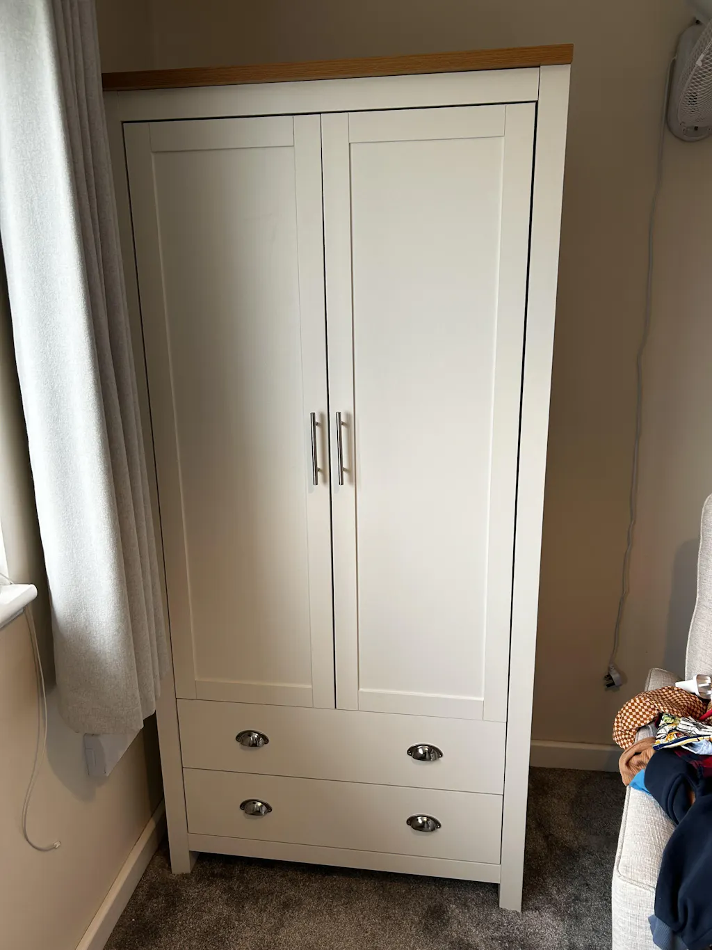 ![[White] shaker double wardrobe with drawers featuring two doors, hanging rail, and two bottom drawers placed against a wall](http://dreamhomestore.co.uk/cdn/shop/files/white-shaker-double-wardrobe-with-drawers-front-view.webp?v=1774353851&width=1214)