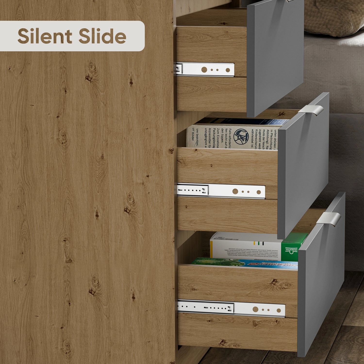 Smooth Glide Drawers: Each cabinet of this bedside drawers comes equipped with a runner mechanism that opens and closes easily, making no noise.