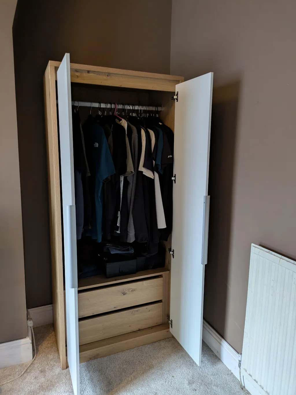 The Skova Double Wardrobe features drawers and a clothes-hanging rail.