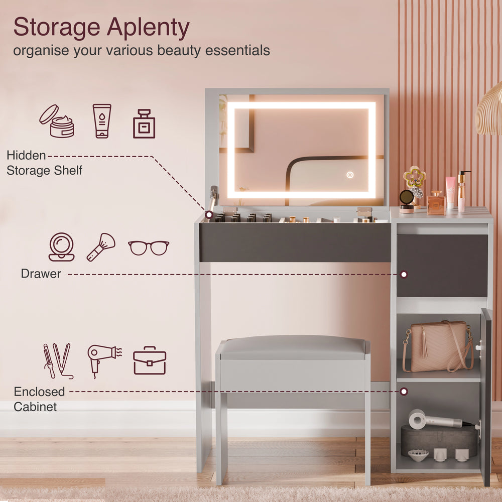 Designed with the modern lifestyle in mind, this flip-top dressing table with mirror and lights keeps your essentials organised, offers perfect lighting, and easily transforms into a desk when you need extra workspace. The mirror opens smoothly to reveal a soft-touch LED mirror with adjustable lighting. Beneath the top, small compartments keep your things like rings, brushes or eyeliner safe, while the side drawer and lower cabinet handle items like dryers and curlers. This vanity dressing table comes with a soft, padded stool that slides smoothly under the table, keeping your setup tidy and ready to use. Available in 5 colour options, it's ready to make getting ready easier.