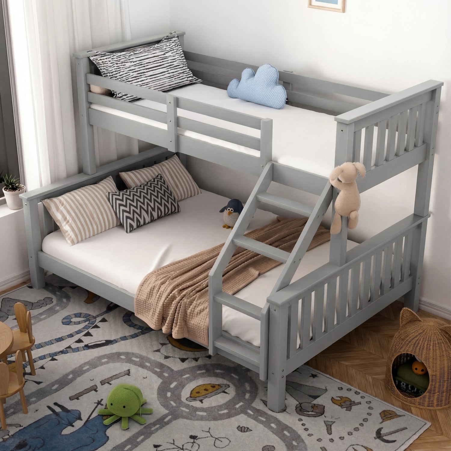 Kid-Friendly Ladder: The steps of the bunk bed's wooden ladder are designed for little feet, turning their climb into an adventure.