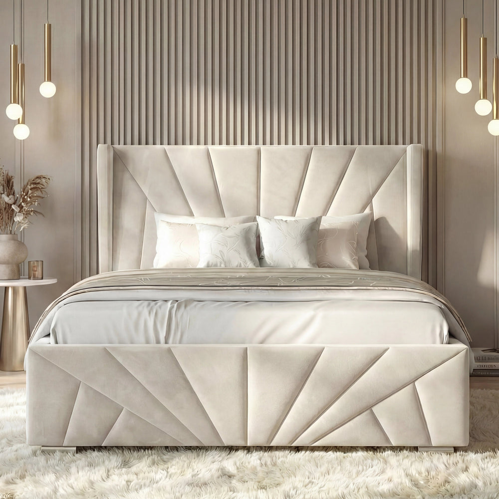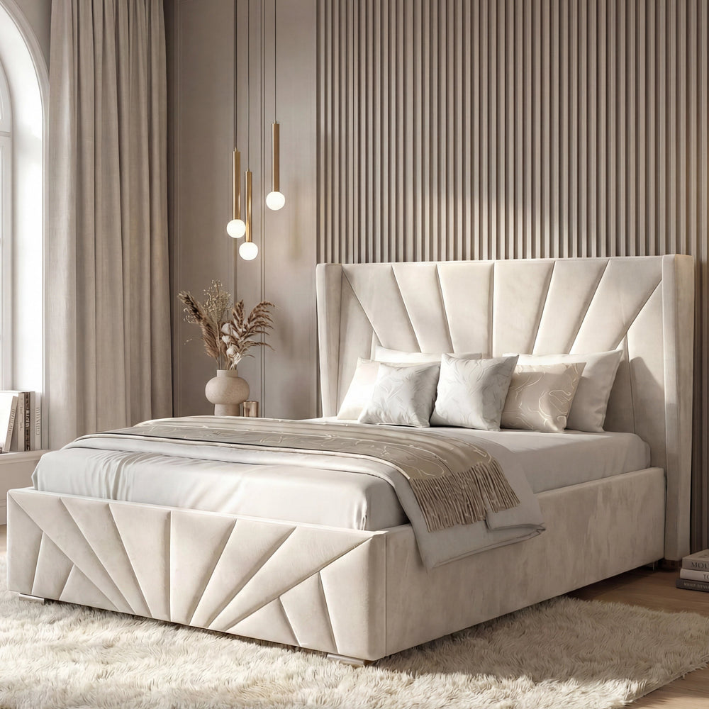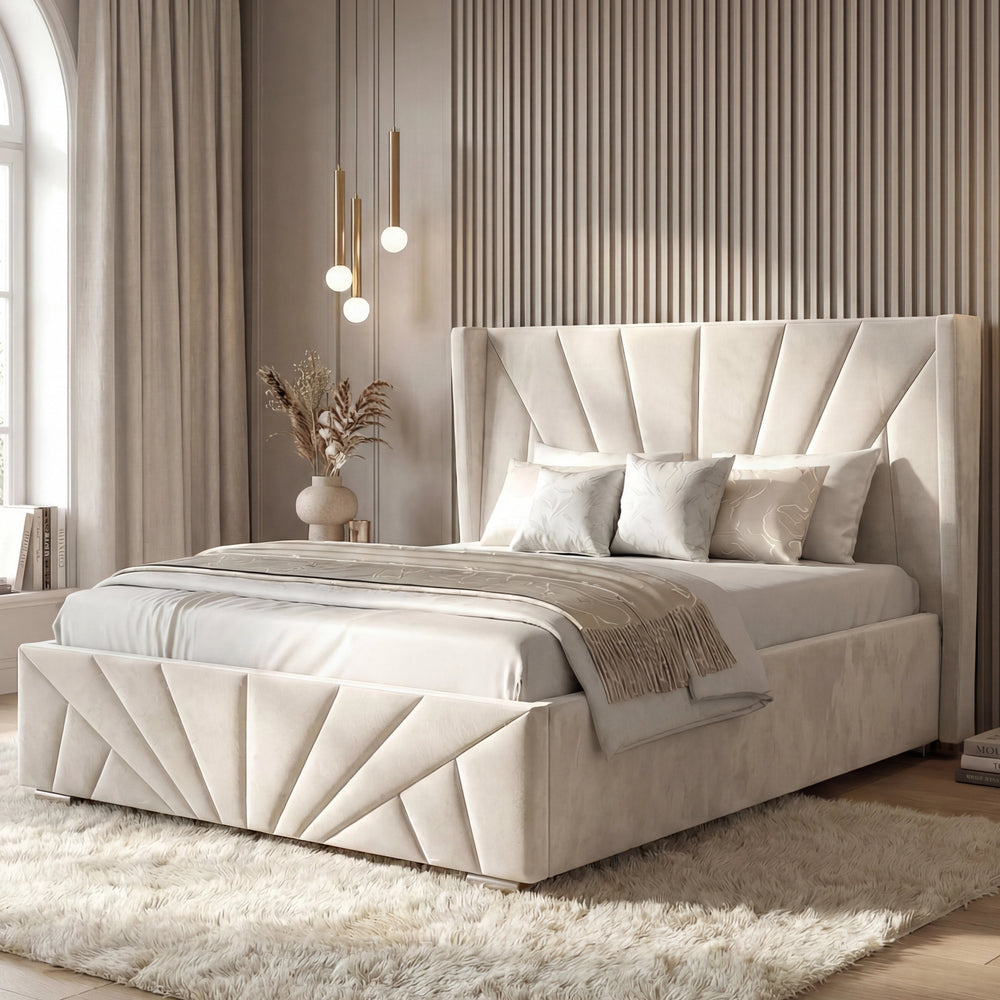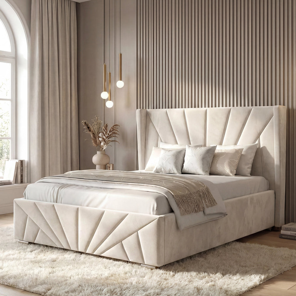 ![[Single | Beige] Velvet Ottoman Storage Bed in beige with Sunrise-style panel design, shown in a modern bedroom setup. Features lift-up storage and plush upholstery.](http://dreamhomestore.co.uk/cdn/shop/files/sunrise-velvet-ottoman-bed-frame-beige.webp?v=1771855785&width=1214)