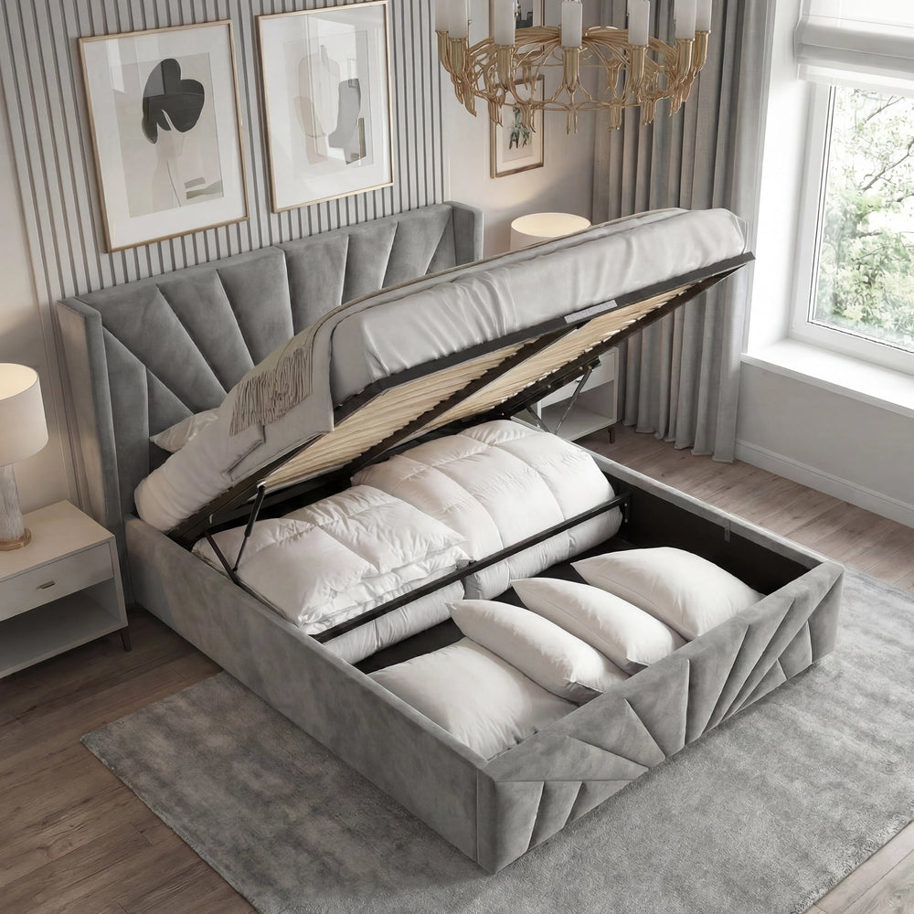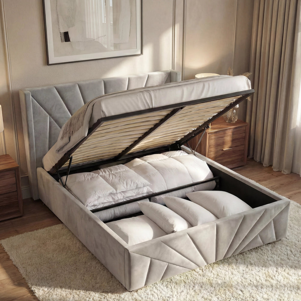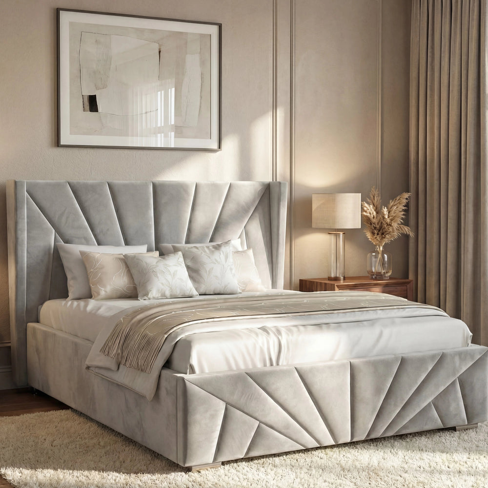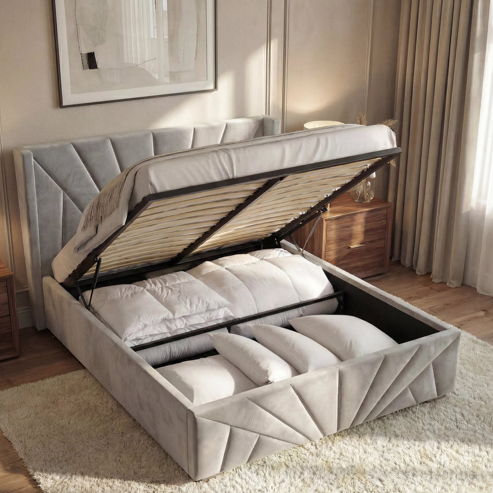 ![[Single | Grey] Sunrise-style Velvet Ottoman Bed Frame in grey with vertical panel tufting. Elegant headboard design adds luxury to this storage platform bed.](http://dreamhomestore.co.uk/cdn/shop/files/sunrise-velvet-ottoman-bed-frame.webp?v=1771855785&width=1214)