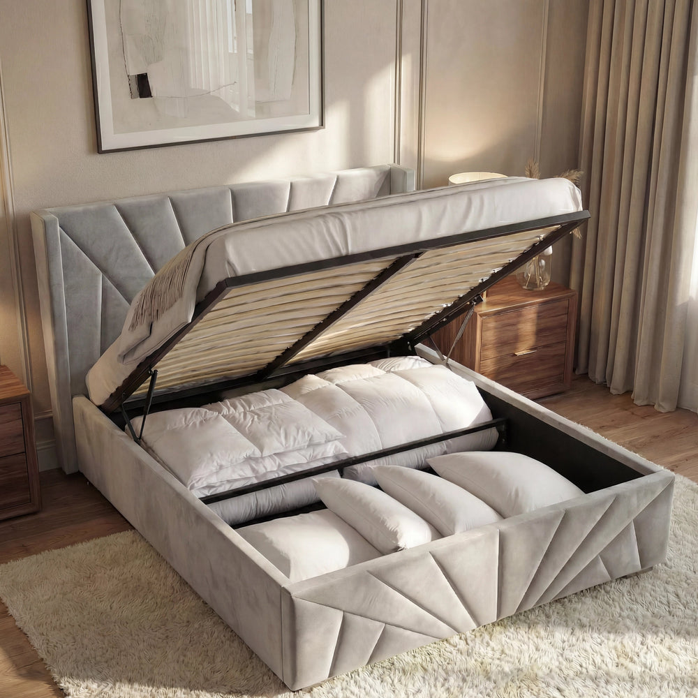 ![[Single | Beige] Velvet Ottoman Storage Bed in beige with Sunrise-style headboard and footboard, shown open to reveal under-bed storage with bedding inside.](http://dreamhomestore.co.uk/cdn/shop/files/beige-sunrise-velvet-ottoman-bed-frame.webp?v=1771855785&width=1214)
