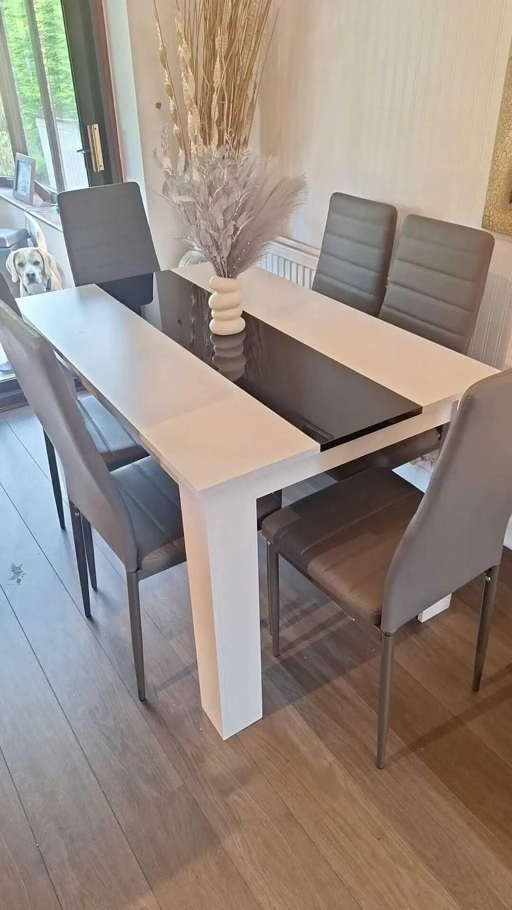 ![[6 Seater | Grey] minimalist dining tables and 6 chairs set featuring white gloss table with black strip and grey chairs](http://dreamhomestore.co.uk/cdn/shop/files/white-black-dining-table-with-6-grey-chairs.webp?v=1771019034&width=1214)