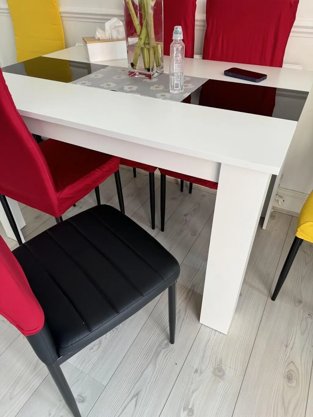 ![[6 Seater | White] front view of 6 seater dining room table in white gloss with black strip 4 people with L shaped legs and engineered wood top](http://dreamhomestore.co.uk/cdn/shop/files/white-black-dining-table-5.webp?v=1771019090&width=1214)