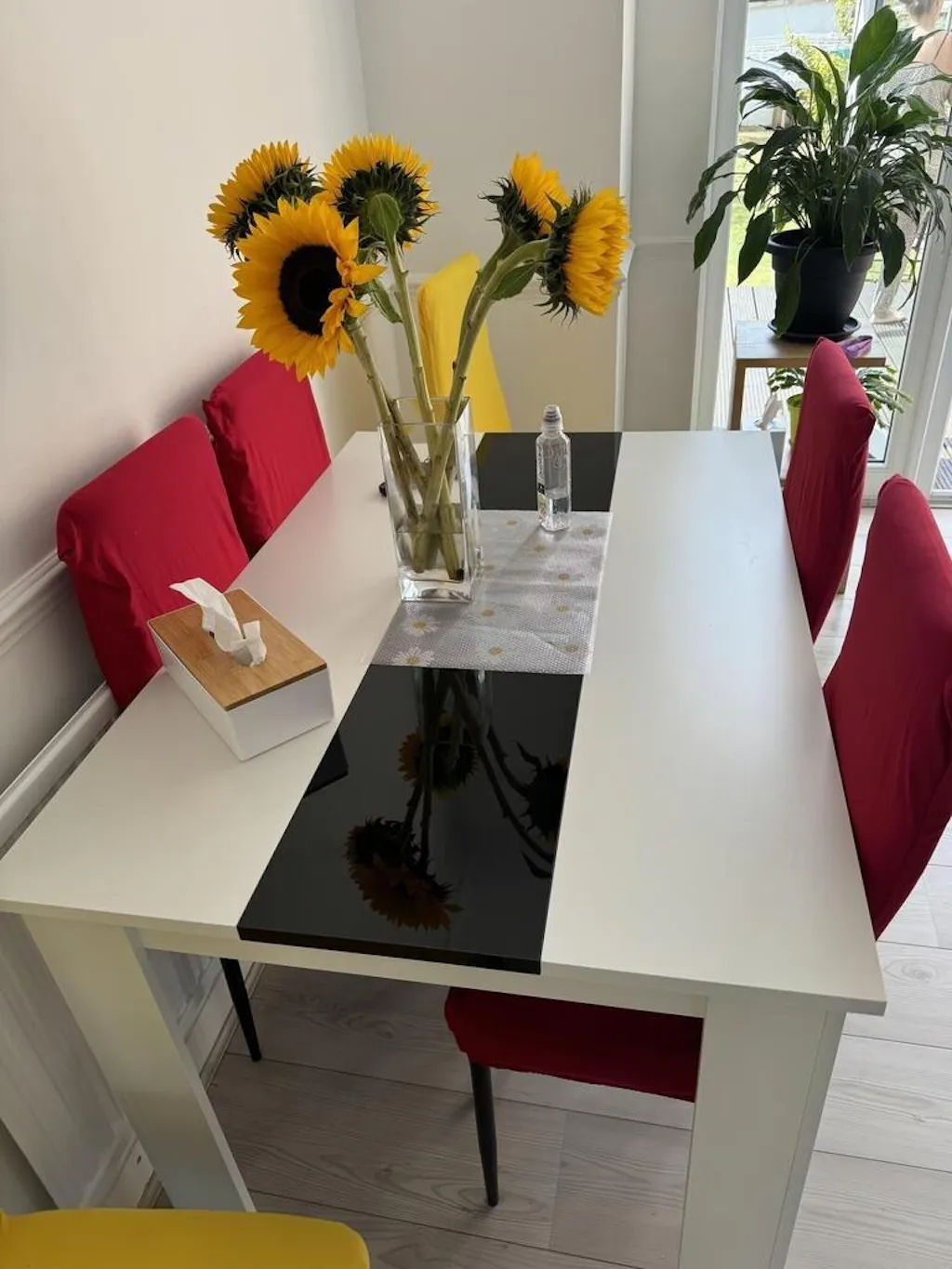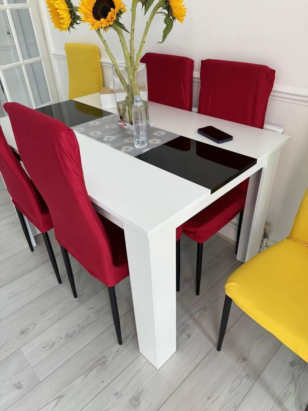 ![[4 Seater | Black] top-down view of white table and chairs featuring gloss black stripe and black upholstered seats](http://dreamhomestore.co.uk/cdn/shop/files/white-black-dining-table-set-with-4-black-chairs-2.webp?v=1771019193&width=1214)