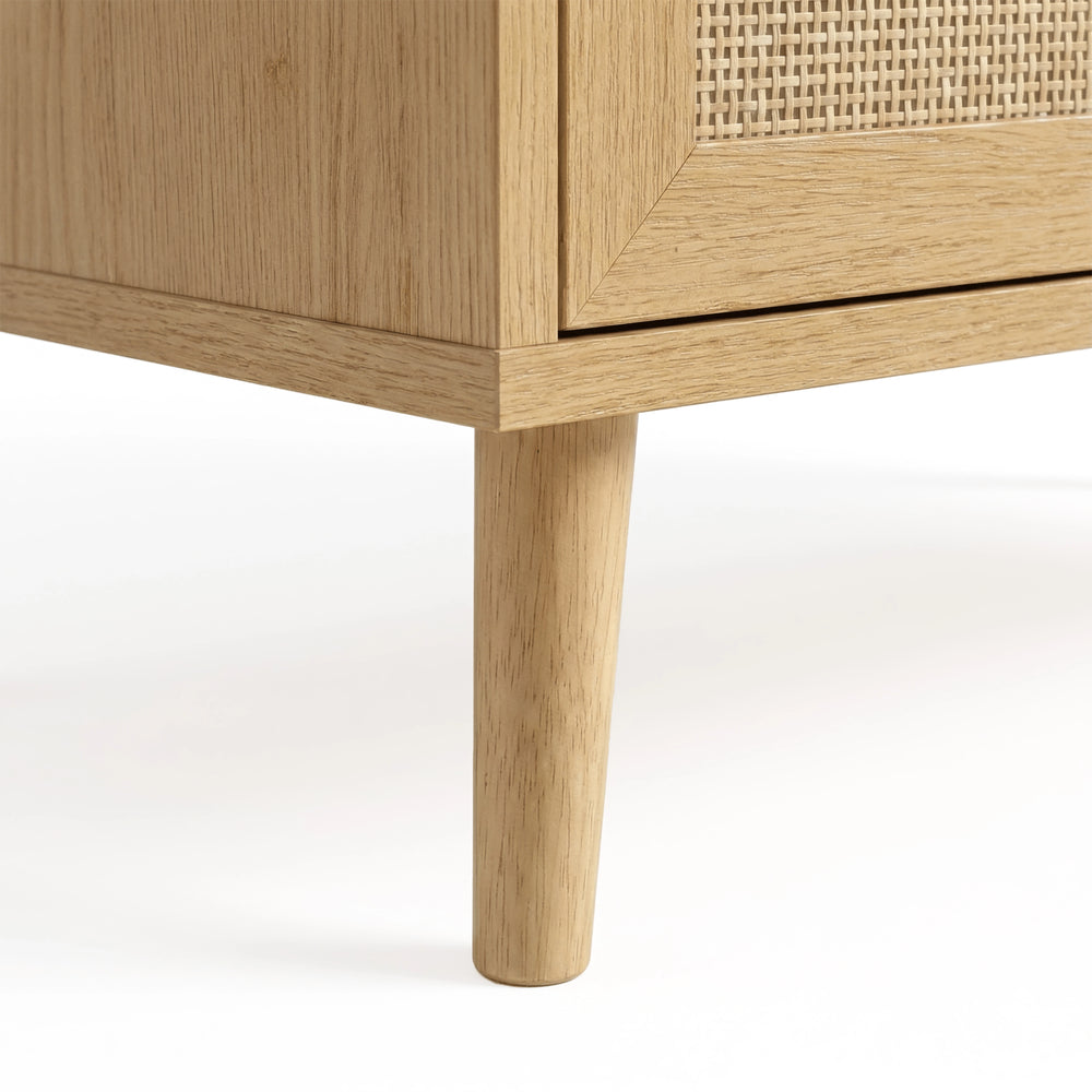 * Rattan cane mesh woven into each oak-toned drawer front for a tonal column of natural texture