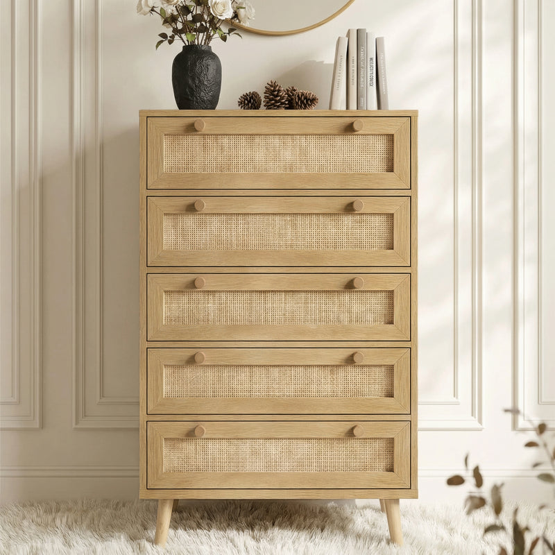 Wovena Oak-Effect Rattan 5 Drawer Tallboy Chest of Drawers