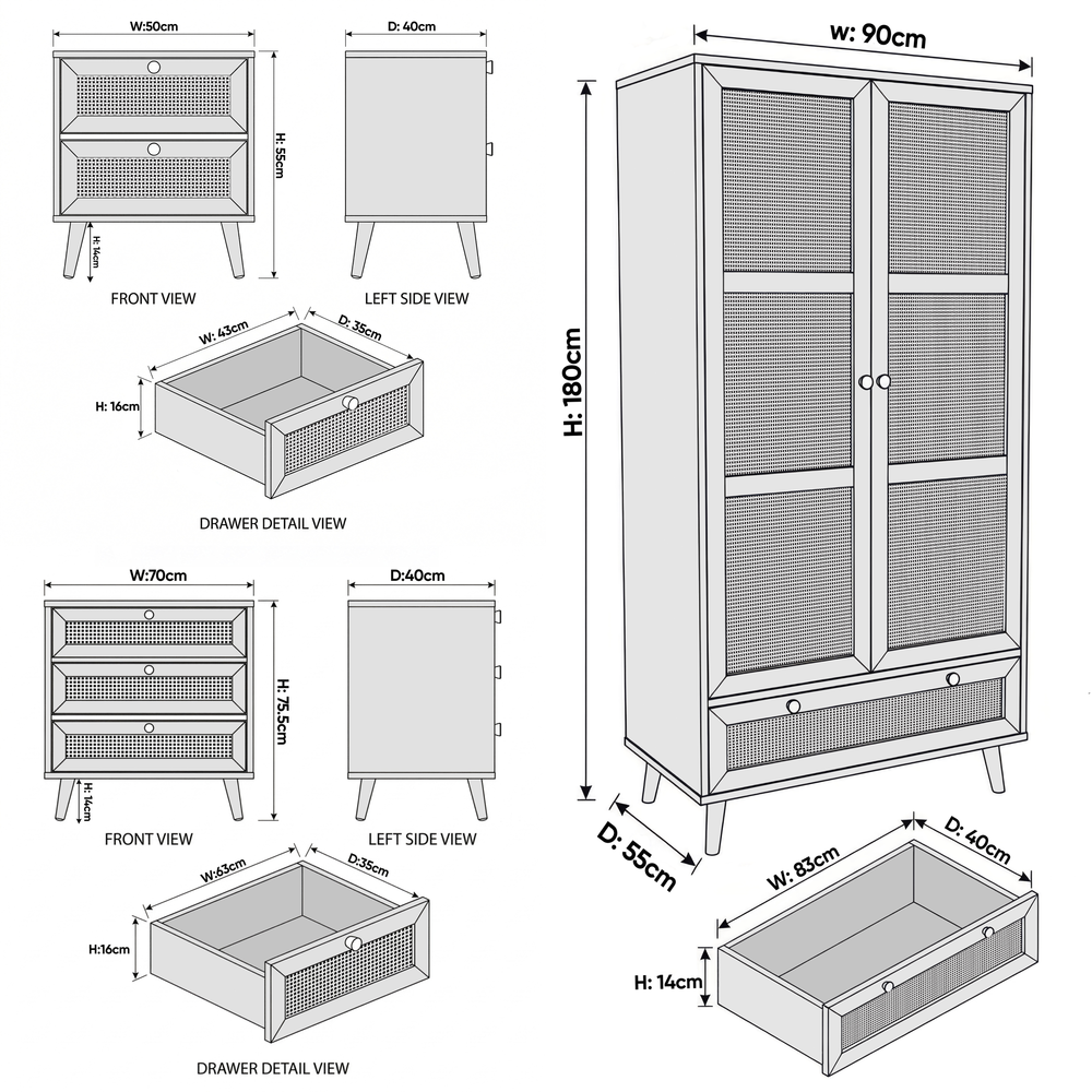 Features: Ample storage, Rattan design, 3 drawers chest, 2 drawer bedside table, 2 door wardrobe, smooth runner hardware, minimalist pine wooden legs & round knobs, smooth automatic closure hinges, magnetic lock, anti-tipping kit, 1 hanging rail, 1 Large Drawer (2 Door wardrobe).