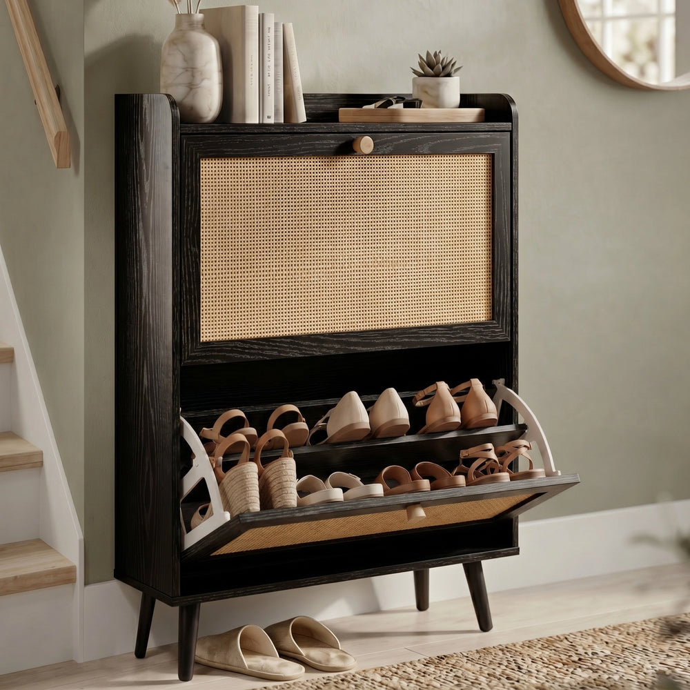![[Black] Wovena shoe cabinet three-quarter angle view with closed rattan panel drawers, mid-century tapered legs, and top shelf styled with books and vase](http://dreamhomestore.co.uk/cdn/shop/files/black-wovena-shoe-cabinet--hallway-side-view.webp?v=1776844976&width=1214)